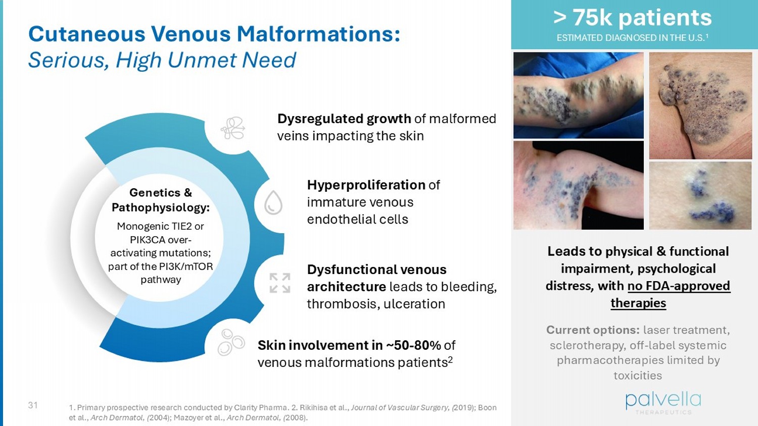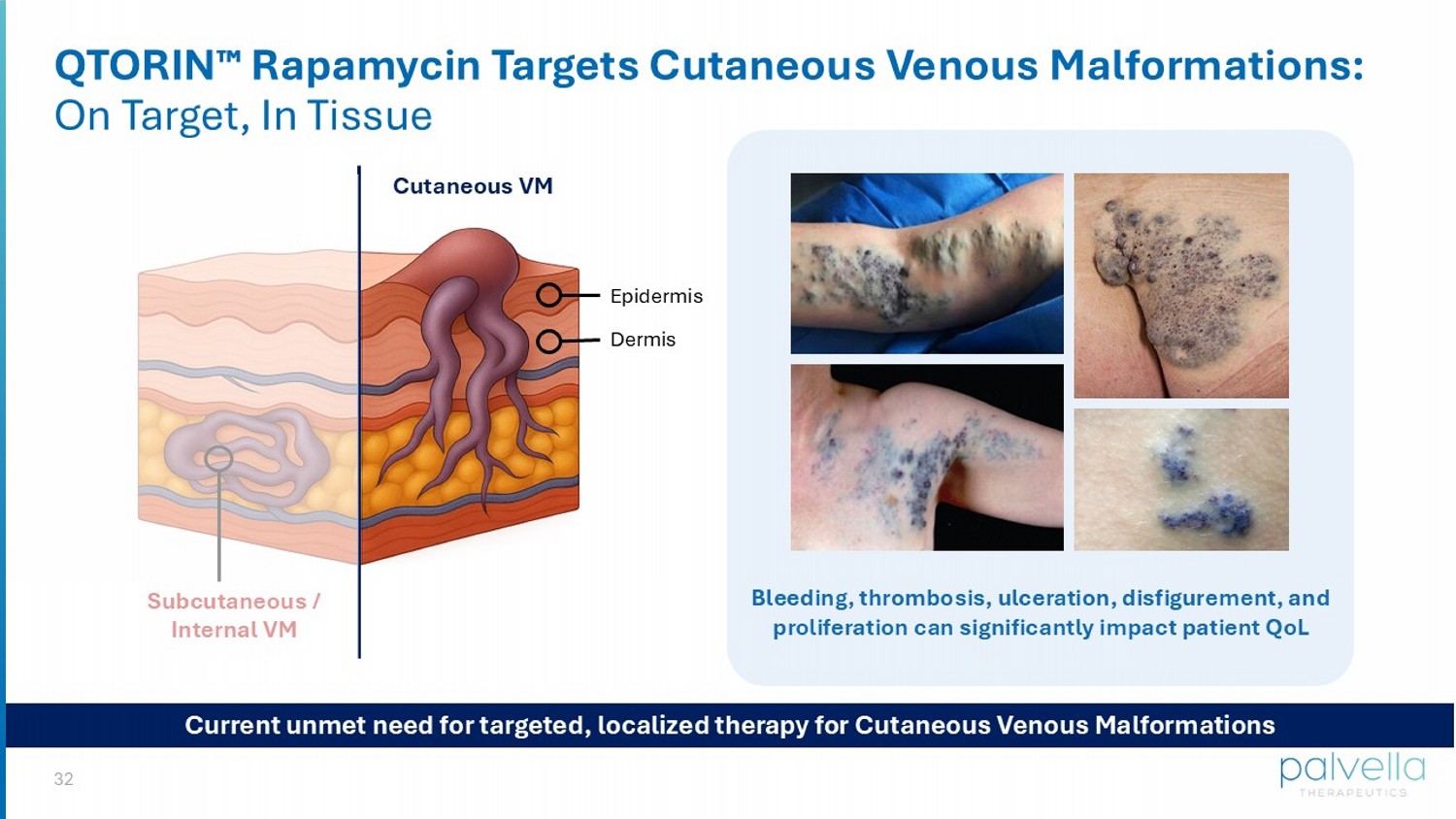 31 Cutaneous Venous Malformations: Serious, High Unmet Need Genetics & Pathophysiology: Monogenic TIE2 or PIK3CA over - activating mutations; part of the PI3K/mTOR pathway Dysregulated growth of malformed veins impacting the skin Dysfunctional venous architecture leads to bleeding, thrombosis, ulceration Hyperproliferation of immature venous endothelial cells Skin involvement in ~50 - 80% of venous malformations patients 2 Leads to physical & functional impairment, psychological distress, with no FDA - approved therapies Current options: laser treatment, sclerotherapy, off - label systemic pharmacotherapies limited by toxicities > 75k patients ESTIMATED DIAGNOSED IN THE U.S. 1 1. Primary prospective research conducted by Clarity Pharma. 2. Rikihisa et al., Journal of Vascular Surgery, ( 2019); Boon et al., Arch Dermatol, ( 2004); Mazoyer et al., Arch Dermatol, ( 2008).