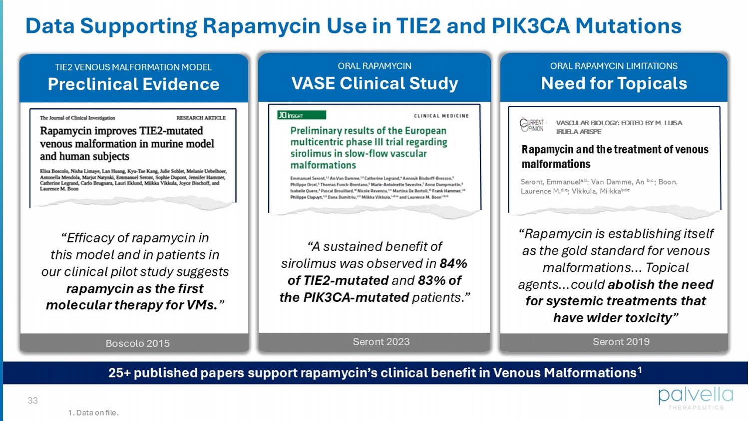 32 Epid ermis Dermis Subcutaneous / Internal VM Cutaneous VM Bleeding, thrombosis, ulceration, disfigurement, and proliferation can significantly impact patient QoL QTORIN Rapamycin Targets Cutaneous Venous Malformations: On Target, In Tissue Current unmet need for targeted, localized therapy for Cutaneous Venous Malformations