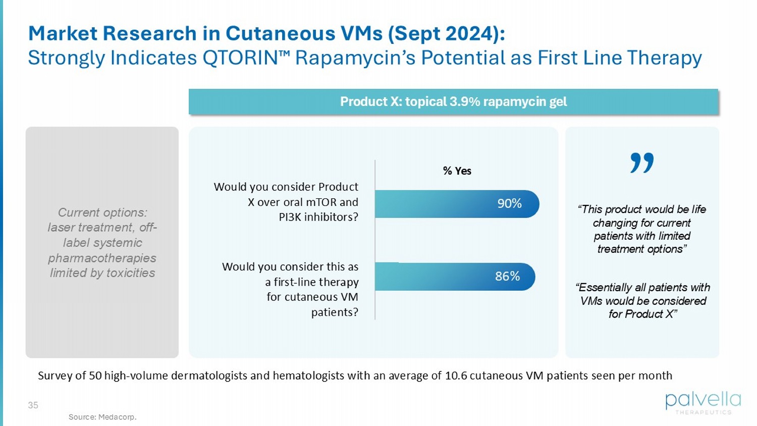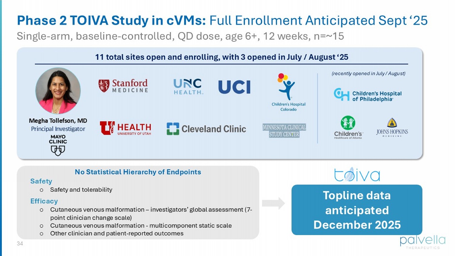 34 Phase 2 TOIVA Study in cVMs: Full Enrollment Anticipated Sept ‘25 Single - arm, baseline - controlled, QD dose, age 6+, 12 weeks, n=~15 No Statistical Hierarchy of Endpoints Safety o Safety and tolerability Efficacy o Cutaneous venous malformation – investigators’ global assessment (7 - point clinician change scale) o Cutaneous venous malformation - multicomponent static scale o Other clinician and patient - reported outcomes Topline data anticipated December 2025 Megha Tollefson, MD Principal Investigator 11 total sites open and enrolling, with 3 opened in July / August ‘25 (recently opened in July / August)