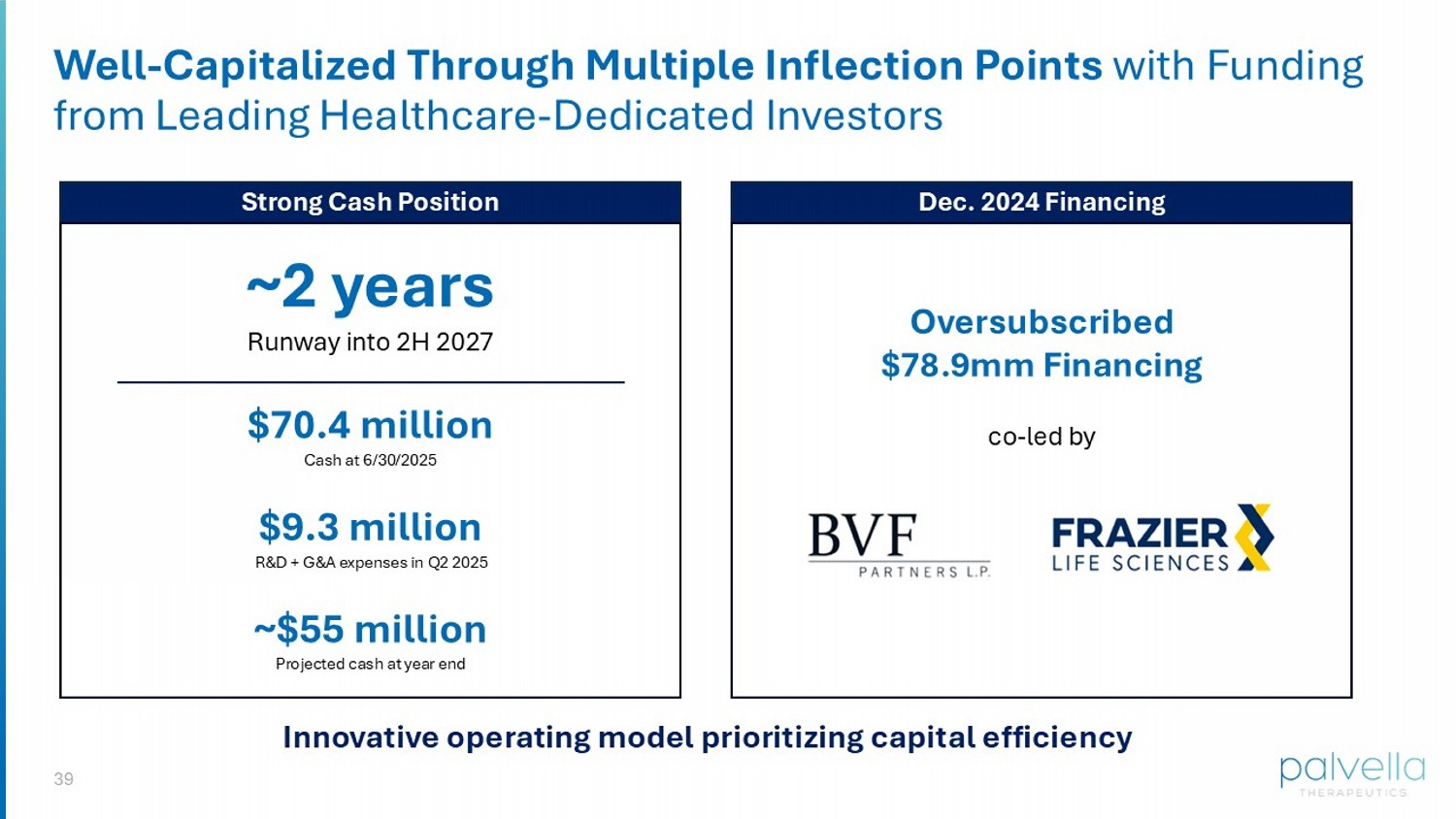 39 Well - Capitalized Through Multiple Inflection Points with Funding from Leading Healthcare - Dedicated Investors Dec. 2024 Financing Strong Cash Position Innovative operating model prioritizing capital efficiency Oversubscribed $78.9mm Financing co - led by ~2 years Runway into 2H 2027 $70.4 million Cash at 6/30/2025 $9.3 million R&D + G&A expenses in Q2 2025 ~$55 million Projected cash at year end