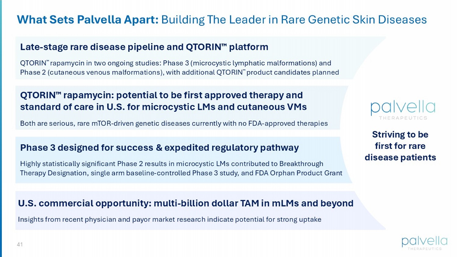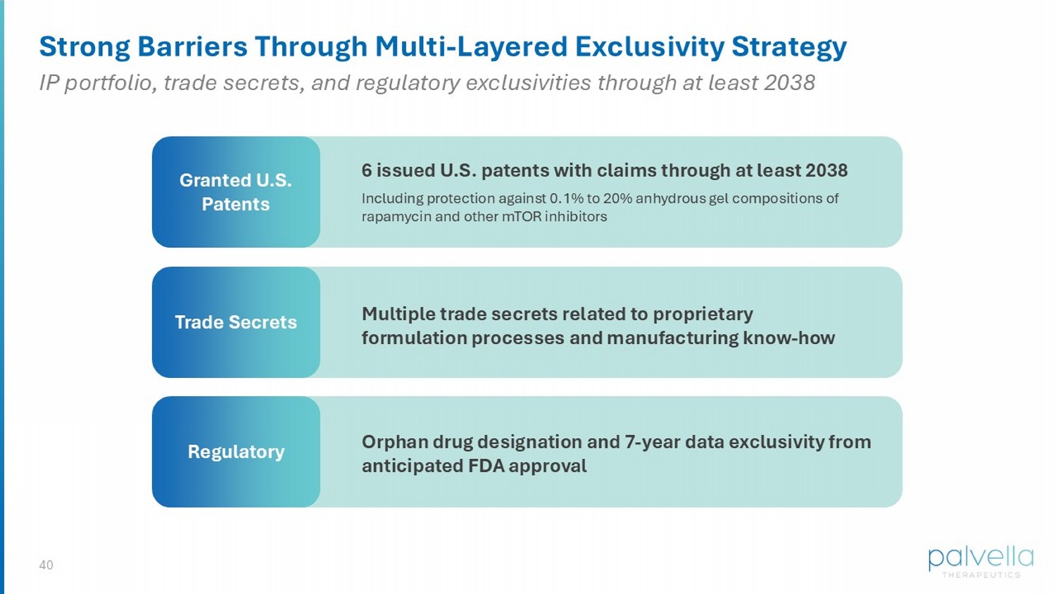40 Strong Barriers Through Multi - Layered Exclusivity Strategy Granted U.S. Patents Trade Secrets Regulatory Orphan drug designation and 7 - year data exclusivity from anticipated FDA approval Multiple trade secrets related to proprietary formulation processes and manufacturing know - how 6 issued U.S. patents with claims through at least 2038 Including protection against 0.1% to 20% anhydrous gel compositions of rapamycin and other mTOR inhibitors IP portfolio, trade secrets, and regulatory exclusivities through at least 2038