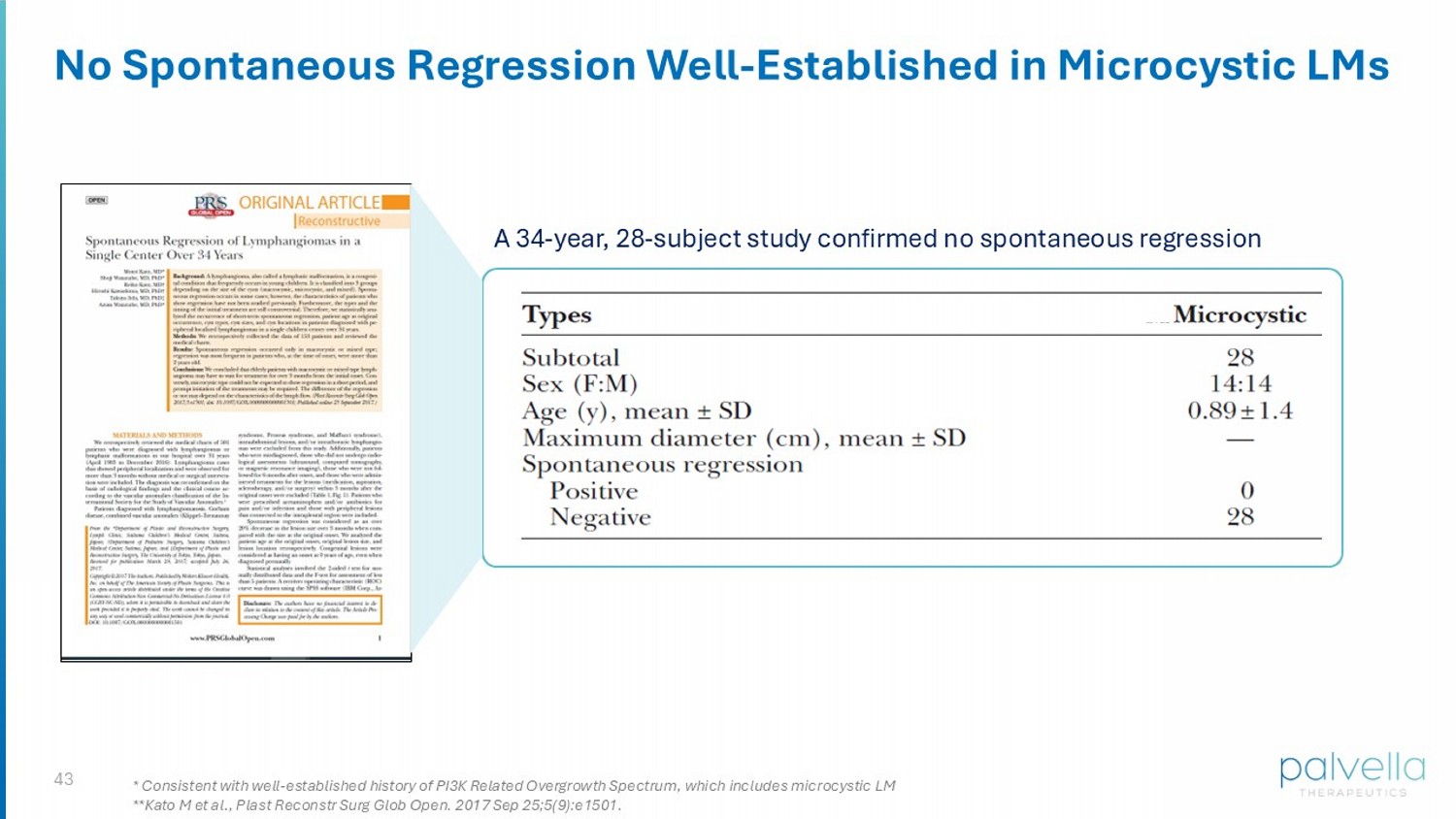 43 A 34 - year, 28 - subject study confirmed no spontaneous regression No Spontaneous Regression Well - Established in Microcystic LMs * Consistent with well - established history of PI3K Related Overgrowth Spectrum, which includes microcystic LM **Kato M et al., Plast Reconstr Surg Glob Open. 2017 Sep 25;5(9):e1501.