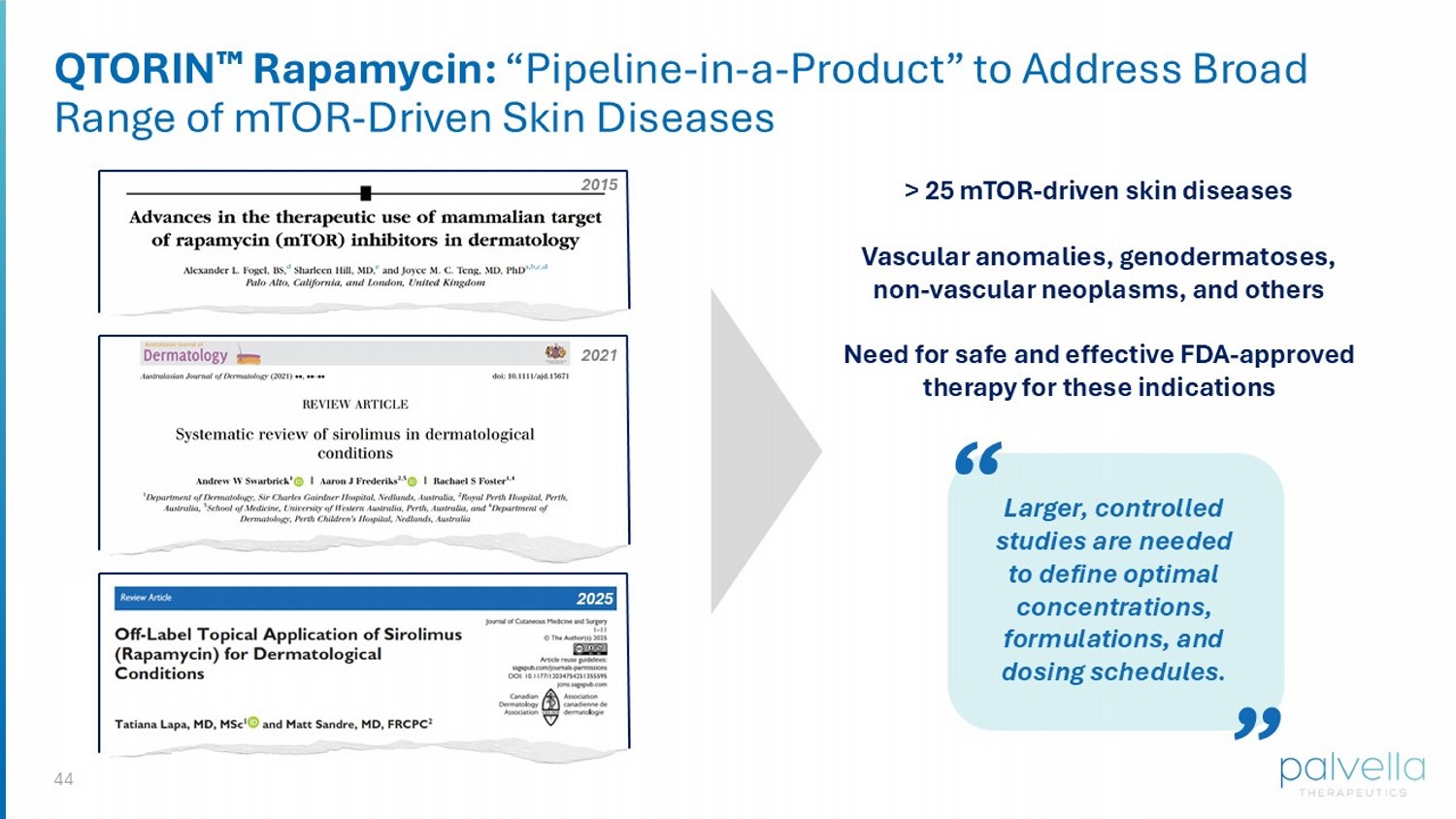 44 QTORIN Rapamycin: “Pipeline - in - a - Product” to Address Broad Range of mTOR - Driven Skin Diseases Larger, controlled studies are needed to define optimal concentrations, formulations, and dosing schedules. “ “ > 25 mTOR - driven skin diseases Vascular anomalies, genodermatoses, non - vascular neoplasms, and others Need for safe and effective FDA - approved therapy for these indications 2015 2021 2025