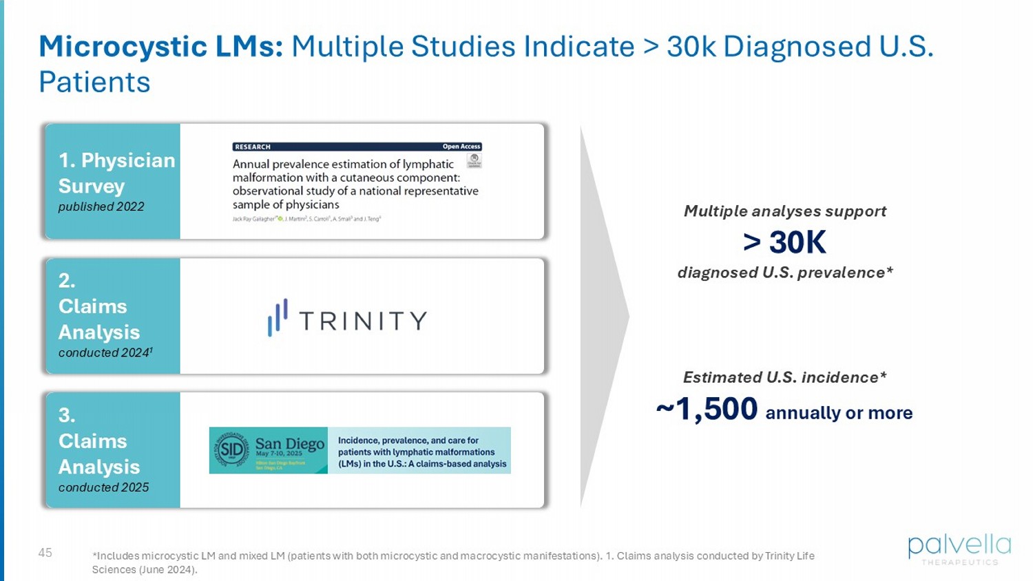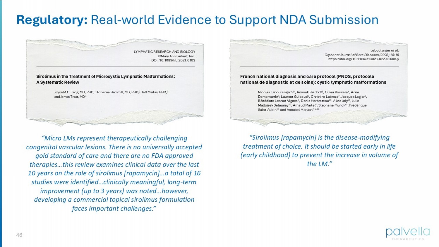 46 Regulatory : Real - world Evidence to Support NDA Submission Sirolimus in th e Treatment of Microcystic Lymphatic Malformations: A Systematic Review Joyce M.C. Teng, MD, PHD, 1 Adrienne Hammill, MD, PHD, 2 Jeff Martini, PHD, 3 and James Treat, MD 4 LYMPHATIC RESEARCH AND BIOLOGY ©Mary Ann Liebert, Inc. DOI: 10.1089/lrb.2021.0103 French national diagnosis and care protocol (PNDS, protocole national de diagnostic et de soins): cystic lymphatic malformations Nicolas Leboulanger 1,2* , Annouk Bisdorff 3 , Olivia Boccara 4 , Anne Dompmartin 5 , Laurent Guibaud 6 , Christine Labreze 7 , Jacques Lagier 8 , Bénédicte Lebrun - Vignes 9 , Denis Herbreteau 10 , Aline Joly 11 , Julie Malloizel - Delaunay 12 , Arnaud Martel 8 , Stéphane Munck 13 , Frédérique Saint - Aubin 14 and Annabel Maruani 15,16 Leboulanger et al. Orphanet Journal of Rare Diseases (2023) 18:10 https://doi.org/10.1186/s13023 - 022 - 02608 - y “Micro LMs represent therapeutically challenging congenital vascular lesions . There is no universally accepted gold standard of care and there are no FDA approved therapies…this review examines clinical data over the last 10 years on the role of sirolimus [rapamycin]…a total of 16 studies were identified…clinically meaningful, long - term improvement (up to 3 years) was noted…however, developing a commercial topical sirolimus formulation faces important challenges.” “Sirolimus [rapamycin] is the disease - modifying treatment of choice. It should be started early in life (early childhood) to prevent the increase in volume of the LM.”