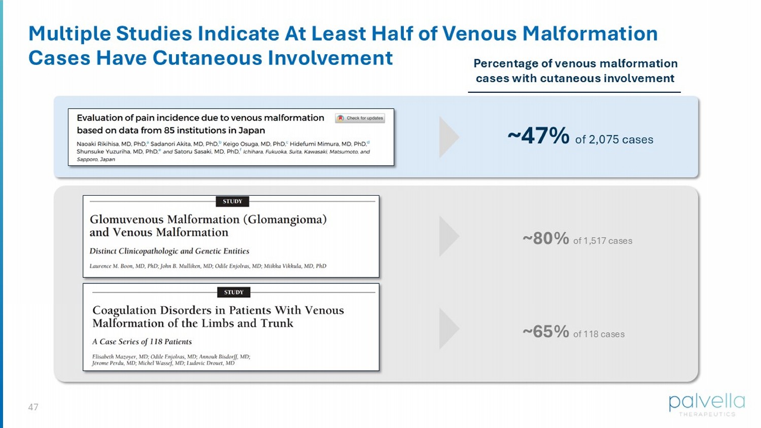 47 Multiple Studies Indicate At Least Half of Venous Malformation Cases Have Cutaneous Involvement ~80% of 1,517 cases ~47% of 2,075 cases ~65% of 118 cases Percentage of venous malformation cases with cutaneous involvement
