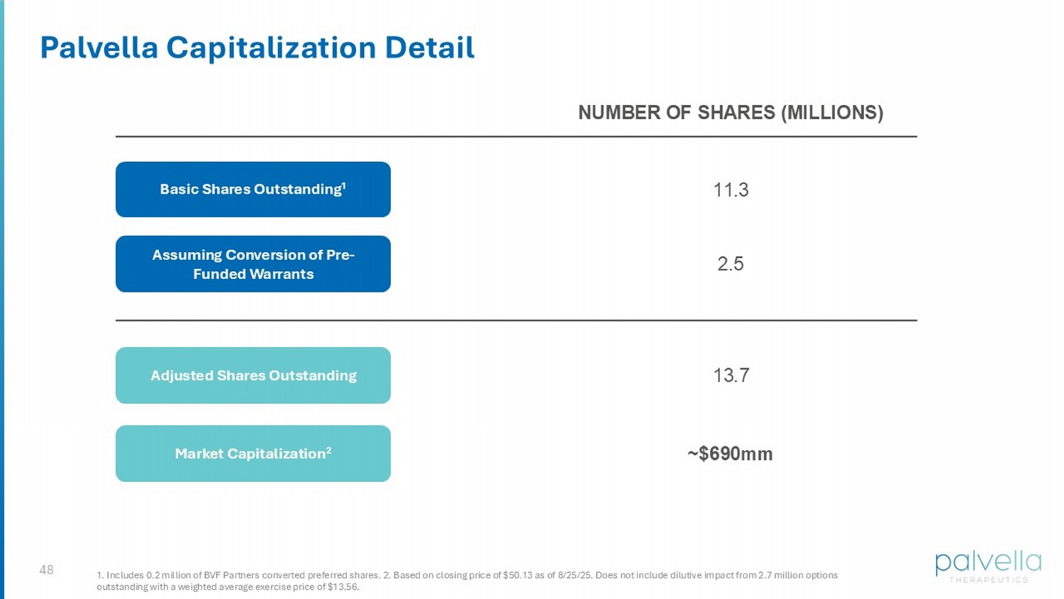48 Palvella Capitalization Detail 1. Includes 0.2 million of BVF Partners converted preferred shares. 2. Based on closing price of $50.13 as of 8/25/25. Does n ot include dilutive impact from 2.7 million options outstanding with a weighted average exercise price of $13.56. Basic Shares Outstanding 1 Assuming Conversion of Pre - Funded Warrants Adjusted Shares Outstanding Market Capitalization 2 NUMBER OF SHARES (MILLIONS) 11. 3 2.5 13.7 ~$ 690 mm