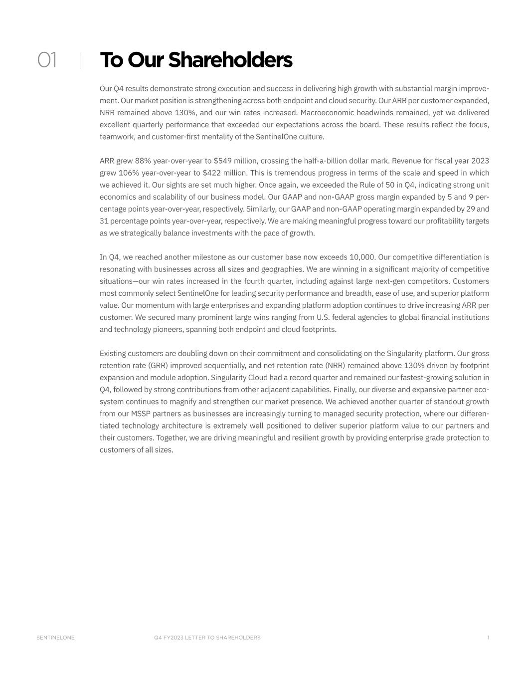 Q4 FY2023 LETTER TO SHAREHOLDERSSENTINELONE 1 To Our Shareholders Our Q4 results demonstrate strong execution and success in delivering high growth with substantial margin improve- ment. Our market position is strengthening across both endpoint and cloud security. Our ARR per customer expanded, NRR remained above 130%, and our win rates increased. Macroeconomic headwinds remained, yet we delivered excellent quarterly performance that exceeded our expectations across the board. These results reflect the focus, teamwork, and customer-first mentality of the SentinelOne culture. ARR grew 88% year-over-year to $549 million, crossing the half-a-billion dollar mark. Revenue for fiscal year 2023 grew 106% year-over-year to $422 million. This is tremendous progress in terms of the scale and speed in which we achieved it. Our sights are set much higher. Once again, we exceeded the Rule of 50 in Q4, indicating strong unit economics and scalability of our business model. Our GAAP and non-GAAP gross margin expanded by 5 and 9 per- centage points year-over-year, respectively. Similarly, our GAAP and non-GAAP operating margin expanded by 29 and 31 percentage points year-over-year, respectively. We are making meaningful progress toward our profitability targets as we strategically balance investments with the pace of growth. In Q4, we reached another milestone as our customer base now exceeds 10,000. Our competitive differentiation is resonating with businesses across all sizes and geographies. We are winning in a significant majority of competitive situations—our win rates increased in the fourth quarter, including against large next-gen competitors. Customers most commonly select SentinelOne for leading security performance and breadth, ease of use, and superior platform value. Our momentum with large enterprises and expanding platform adoption continues to drive increasing ARR per customer. We secured many prominent large wins ranging from U.S. federal agencies to global financial institutions and technology pioneers, spanning both endpoint and cloud footprints. Existing customers are doubling down on their commitment and consolidating on the Singularity platform. Our gross retention rate (GRR) improved sequentially, and net retention rate (NRR) remained above 130% driven by footprint expansion and module adoption. Singularity Cloud had a record quarter and remained our fastest-growing solution in Q4, followed by strong contributions from other adjacent capabilities. Finally, our diverse and expansive partner eco- system continues to magnify and strengthen our market presence. We achieved another quarter of standout growth from our MSSP partners as businesses are increasingly turning to managed security protection, where our differen- tiated technology architecture is extremely well positioned to deliver superior platform value to our partners and their customers. Together, we are driving meaningful and resilient growth by providing enterprise grade protection to customers of all sizes. 01