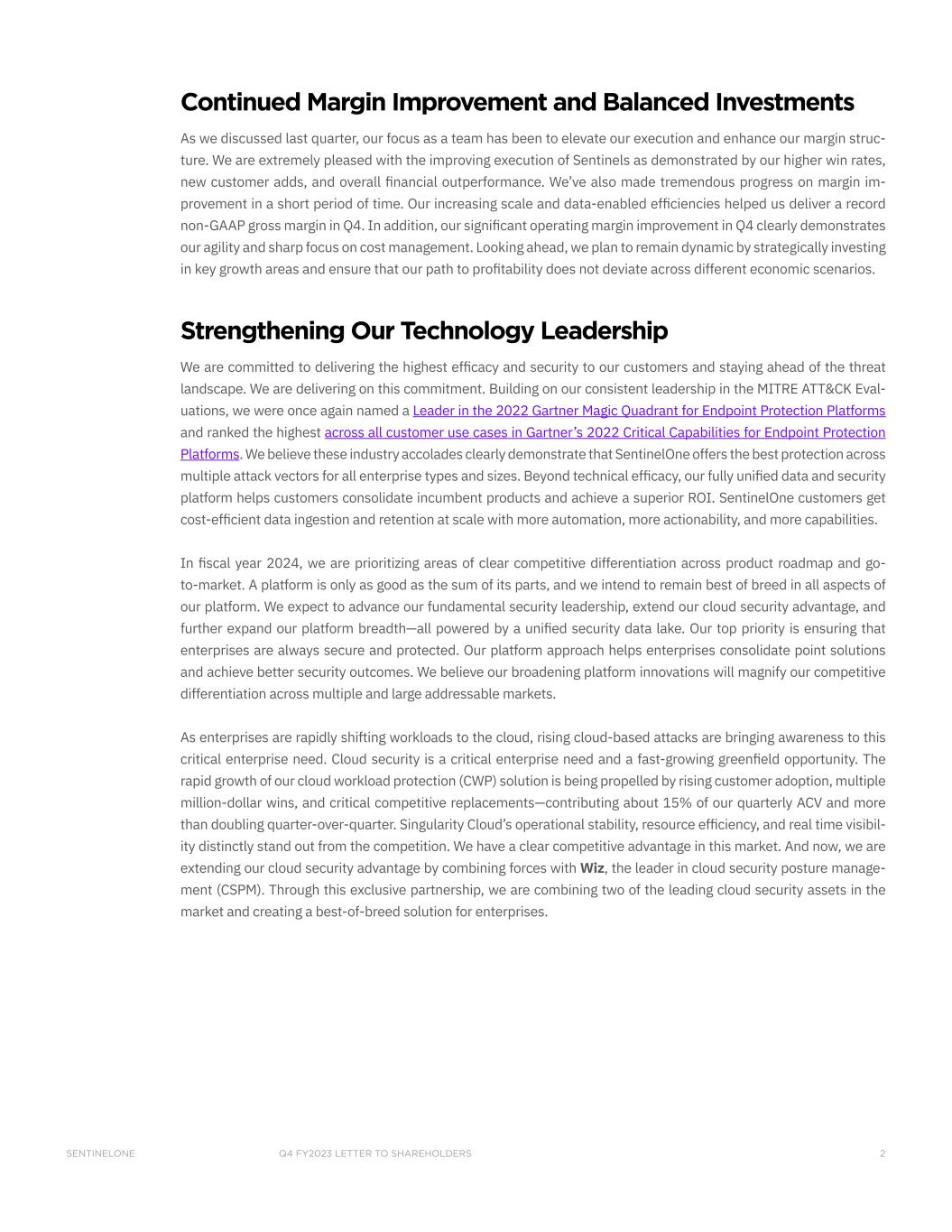 Q4 FY2023 LETTER TO SHAREHOLDERSSENTINELONE 2 Continued Margin Improvement and Balanced Investments As we discussed last quarter, our focus as a team has been to elevate our execution and enhance our margin struc- ture. We are extremely pleased with the improving execution of Sentinels as demonstrated by our higher win rates, new customer adds, and overall financial outperformance. We’ve also made tremendous progress on margin im- provement in a short period of time. Our increasing scale and data-enabled efficiencies helped us deliver a record non-GAAP gross margin in Q4. In addition, our significant operating margin improvement in Q4 clearly demonstrates our agility and sharp focus on cost management. Looking ahead, we plan to remain dynamic by strategically investing in key growth areas and ensure that our path to profitability does not deviate across different economic scenarios. Strengthening Our Technology Leadership We are committed to delivering the highest efficacy and security to our customers and staying ahead of the threat landscape. We are delivering on this commitment. Building on our consistent leadership in the MITRE ATT&CK Eval- uations, we were once again named a Leader in the 2022 Gartner Magic Quadrant for Endpoint Protection Platforms and ranked the highest across all customer use cases in Gartner’s 2022 Critical Capabilities for Endpoint Protection Platforms. We believe these industry accolades clearly demonstrate that SentinelOne offers the best protection across multiple attack vectors for all enterprise types and sizes. Beyond technical efficacy, our fully unified data and security platform helps customers consolidate incumbent products and achieve a superior ROI. SentinelOne customers get cost-efficient data ingestion and retention at scale with more automation, more actionability, and more capabilities. In fiscal year 2024, we are prioritizing areas of clear competitive differentiation across product roadmap and go- to-market. A platform is only as good as the sum of its parts, and we intend to remain best of breed in all aspects of our platform. We expect to advance our fundamental security leadership, extend our cloud security advantage, and further expand our platform breadth—all powered by a unified security data lake. Our top priority is ensuring that enterprises are always secure and protected. Our platform approach helps enterprises consolidate point solutions and achieve better security outcomes. We believe our broadening platform innovations will magnify our competitive differentiation across multiple and large addressable markets. As enterprises are rapidly shifting workloads to the cloud, rising cloud-based attacks are bringing awareness to this critical enterprise need. Cloud security is a critical enterprise need and a fast-growing greenfield opportunity. The rapid growth of our cloud workload protection (CWP) solution is being propelled by rising customer adoption, multiple million-dollar wins, and critical competitive replacements—contributing about 15% of our quarterly ACV and more than doubling quarter-over-quarter. Singularity Cloud’s operational stability, resource efficiency, and real time visibil- ity distinctly stand out from the competition. We have a clear competitive advantage in this market. And now, we are extending our cloud security advantage by combining forces with Wiz, the leader in cloud security posture manage- ment (CSPM). Through this exclusive partnership, we are combining two of the leading cloud security assets in the market and creating a best-of-breed solution for enterprises.