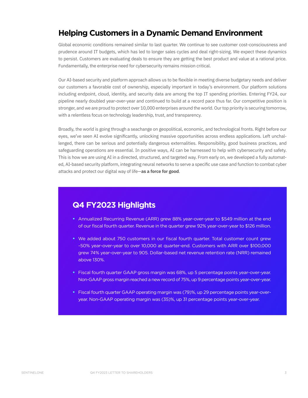 Q4 FY2023 LETTER TO SHAREHOLDERSSENTINELONE 3 Q4 FY2023 Highlights • Annualized Recurring Revenue (ARR) grew 88% year-over-year to $549 million at the end of our fiscal fourth quarter. Revenue in the quarter grew 92% year-over-year to $126 million. • We added about 750 customers in our fiscal fourth quarter. Total customer count grew ~50% year-over-year to over 10,000 at quarter-end. Customers with ARR over $100,000 grew 74% year-over-year to 905. Dollar-based net revenue retention rate (NRR) remained above 130%. • Fiscal fourth quarter GAAP gross margin was 68%, up 5 percentage points year-over-year. Non-GAAP gross margin reached a new record of 75%, up 9 percentage points year-over-year. • Fiscal fourth quarter GAAP operating margin was (79)%, up 29 percentage points year-over- year. Non-GAAP operating margin was (35)%, up 31 percentage points year-over-year. Helping Customers in a Dynamic Demand Environment Global economic conditions remained similar to last quarter. We continue to see customer cost-consciousness and prudence around IT budgets, which has led to longer sales cycles and deal right-sizing. We expect these dynamics to persist. Customers are evaluating deals to ensure they are getting the best product and value at a rational price. Fundamentally, the enterprise need for cybersecurity remains mission critical. Our AI-based security and platform approach allows us to be flexible in meeting diverse budgetary needs and deliver our customers a favorable cost of ownership, especially important in today’s environment. Our platform solutions including endpoint, cloud, identity, and security data are among the top IT spending priorities. Entering FY24, our pipeline nearly doubled year-over-year and continued to build at a record pace thus far. Our competitive position is stronger, and we are proud to protect over 10,000 enterprises around the world. Our top priority is securing tomorrow, with a relentless focus on technology leadership, trust, and transparency. Broadly, the world is going through a seachange on geopolitical, economic, and technological fronts. Right before our eyes, we’ve seen AI evolve significantly, unlocking massive opportunities across endless applications. Left unchal- lenged, there can be serious and potentially dangerous externalities. Responsibility, good business practices, and safeguarding operations are essential. In positive ways, AI can be harnessed to help with cybersecurity and safety. This is how we are using AI in a directed, structured, and targeted way. From early on, we developed a fully automat- ed, AI-based security platform, integrating neural networks to serve a specific use case and function to combat cyber attacks and protect our digital way of life—as a force for good.