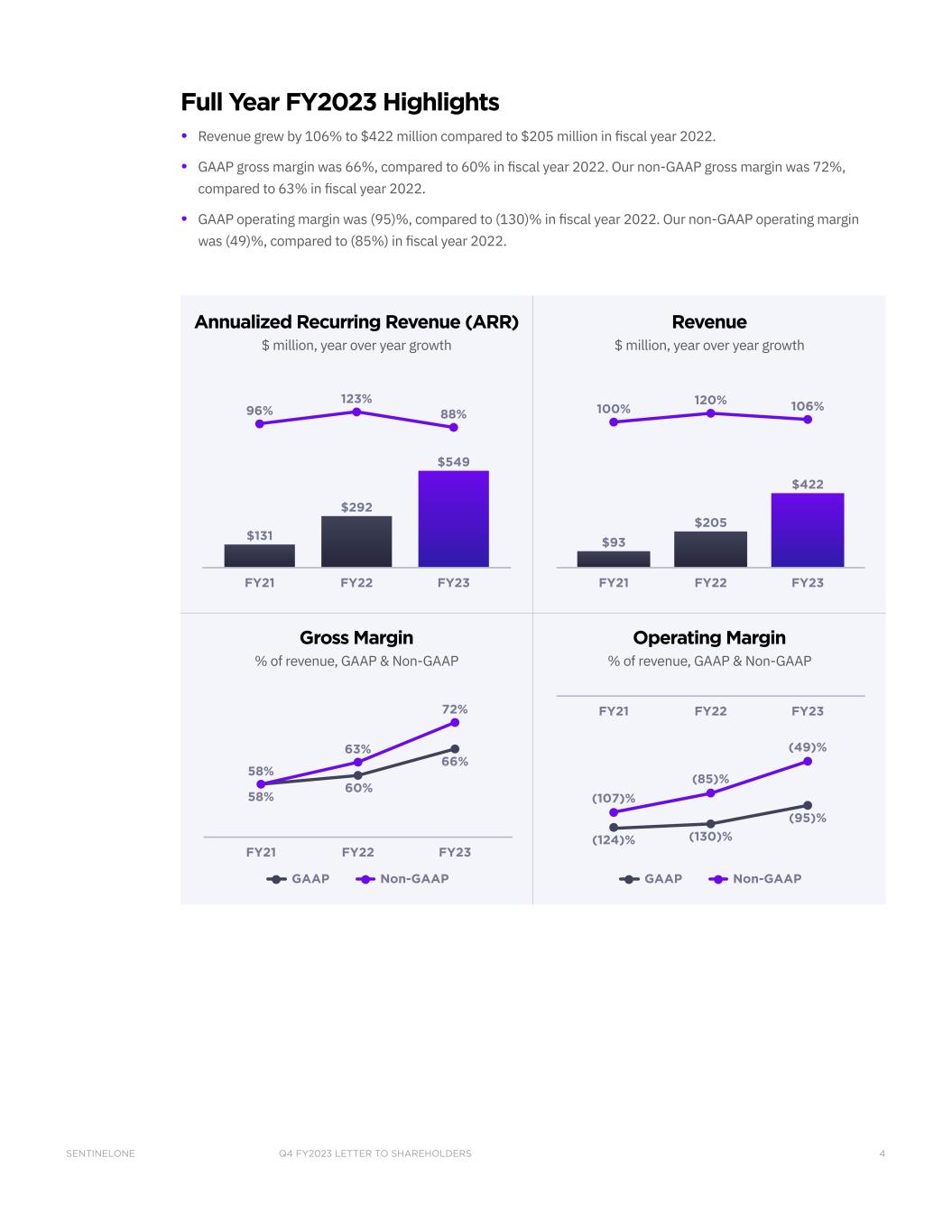 Q4 FY2023 LETTER TO SHAREHOLDERSSENTINELONE 4 Full Year FY2023 Highlights • Revenue grew by 106% to $422 million compared to $205 million in fiscal year 2022. • GAAP gross margin was 66%, compared to 60% in fiscal year 2022. Our non-GAAP gross margin was 72%, compared to 63% in fiscal year 2022. • GAAP operating margin was (95)%, compared to (130)% in fiscal year 2022. Our non-GAAP operating margin was (49)%, compared to (85%) in fiscal year 2022. Annualized Recurring Revenue (ARR) $ million, year over year growth Revenue $ million, year over year growth Gross Margin % of revenue, GAAP & Non-GAAP Operating Margin % of revenue, GAAP & Non-GAAP 60% 63% 58% 58% FY21 FY22 66% 72% FY23 GAAP Non-GAAP (130)% (85)% (124)% (107)% FY21 FY22 (95)% (49)% FY23 GAAP Non-GAAP FY21 $131 $292 FY22 $549 FY23 96% 123% 88% $93 $205 100% 120% FY21 FY22 $422 106% FY23