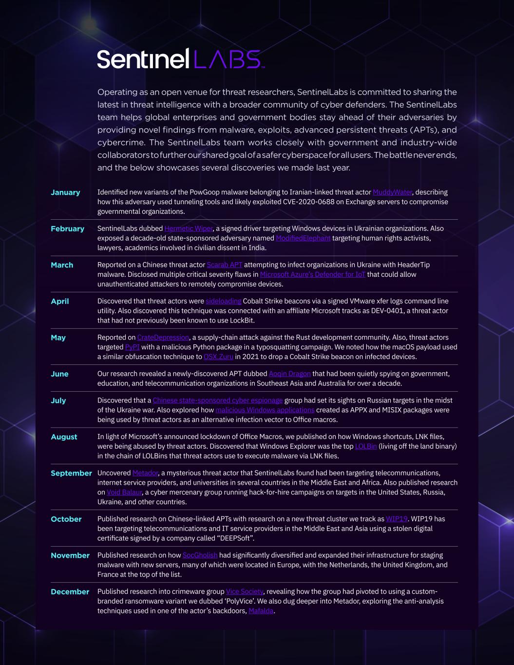 Operating as an open venue for threat researchers, SentinelLabs is committed to sharing the latest in threat intelligence with a broader community of cyber defenders. The SentinelLabs team helps global enterprises and government bodies stay ahead of their adversaries by providing novel findings from malware, exploits, advanced persistent threats (APTs), and cybercrime. The SentinelLabs team works closely with government and industry-wide collaborators to further our shared goal of a safer cyberspace for all users. The battle never ends, and the below showcases several discoveries we made last year. January Identified new variants of the PowGoop malware belonging to Iranian-linked threat actor MuddyWater, describing how this adversary used tunneling tools and likely exploited CVE-2020-0688 on Exchange servers to compromise governmental organizations. February SentinelLabs dubbed Hermetic Wiper, a signed driver targeting Windows devices in Ukrainian organizations. Also exposed a decade-old state-sponsored adversary named ModifiedElephant targeting human rights activists, lawyers, academics involved in civilian dissent in India. March Reported on a Chinese threat actor Scarab APT attempting to infect organizations in Ukraine with HeaderTip malware. Disclosed multiple critical severity flaws in Microsoft Azure’s Defender for IoT that could allow unauthenticated attackers to remotely compromise devices. April Discovered that threat actors were sideloading Cobalt Strike beacons via a signed VMware xfer logs command line utility. Also discovered this technique was connected with an affiliate Microsoft tracks as DEV-0401, a threat actor that had not previously been known to use LockBit. May Reported on CrateDepression, a supply-chain attack against the Rust development community. Also, threat actors targeted PyPI with a malicious Python package in a typosquatting campaign. We noted how the macOS payload used a similar obfuscation technique to OSX.Zuru in 2021 to drop a Cobalt Strike beacon on infected devices. June Our research revealed a newly-discovered APT dubbed Aoqin Dragon that had been quietly spying on government, education, and telecommunication organizations in Southeast Asia and Australia for over a decade. July Discovered that a Chinese state-sponsored cyber espionage group had set its sights on Russian targets in the midst of the Ukraine war. Also explored how malicious Windows applications created as APPX and MISIX packages were being used by threat actors as an alternative infection vector to Office macros. August In light of Microsoft’s announced lockdown of Office Macros, we published on how Windows shortcuts, LNK files, were being abused by threat actors. Discovered that Windows Explorer was the top LOLBin (living off the land binary) in the chain of LOLBins that threat actors use to execute malware via LNK files. September Uncovered Metador, a mysterious threat actor that SentinelLabs found had been targeting telecommunications, internet service providers, and universities in several countries in the Middle East and Africa. Also published research on Void Balaur, a cyber mercenary group running hack-for-hire campaigns on targets in the United States, Russia, Ukraine, and other countries. October Published research on Chinese-linked APTs with research on a new threat cluster we track as WIP19. WIP19 has been targeting telecommunications and IT service providers in the Middle East and Asia using a stolen digital certificate signed by a company called “DEEPSoft”. November Published research on how SocGholish had significantly diversified and expanded their infrastructure for staging malware with new servers, many of which were located in Europe, with the Netherlands, the United Kingdom, and France at the top of the list. December Published research into crimeware group Vice Society, revealing how the group had pivoted to using a custom- branded ransomware variant we dubbed ‘PolyVice’. We also dug deeper into Metador, exploring the anti-analysis techniques used in one of the actor’s backdoors, Mafalda.