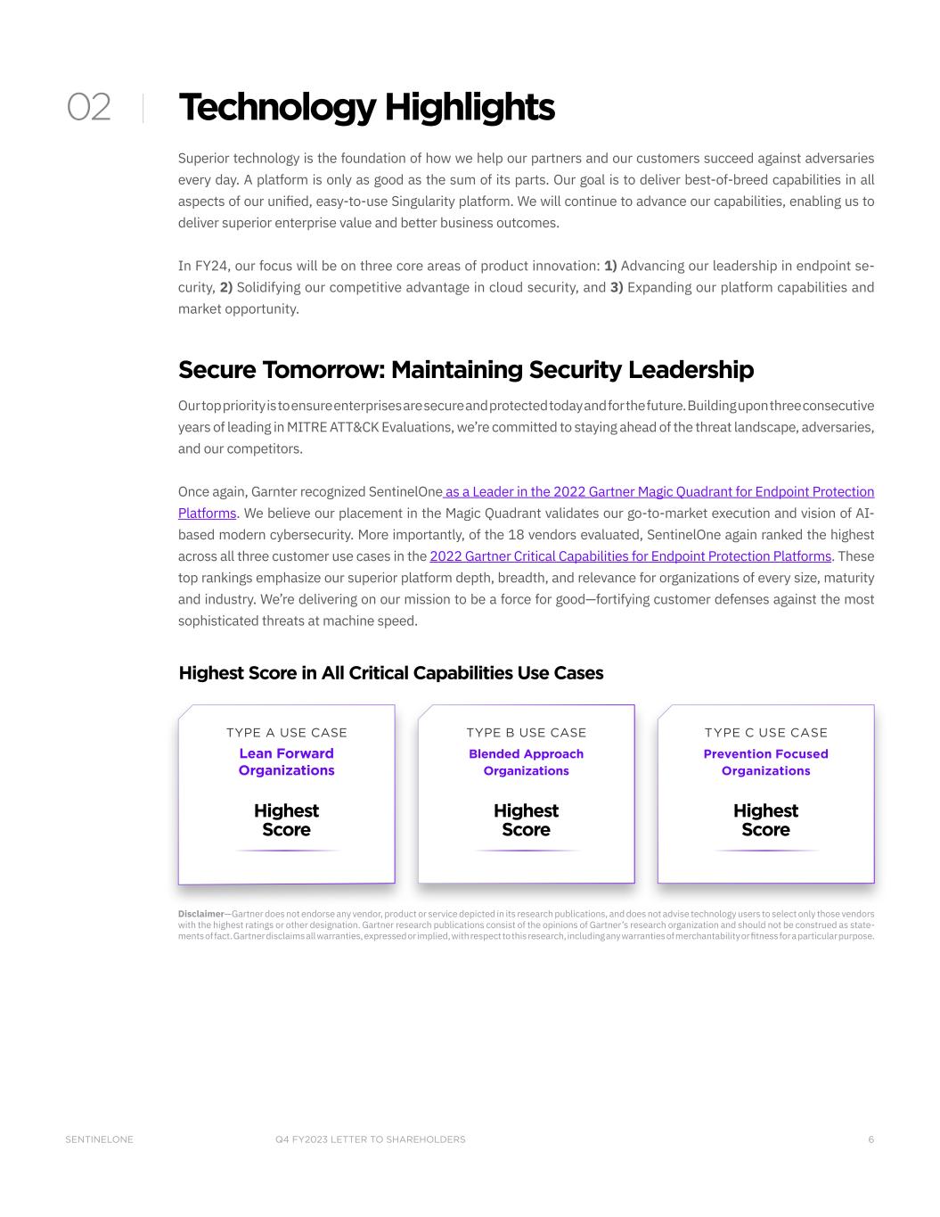 Q4 FY2023 LETTER TO SHAREHOLDERSSENTINELONE 6 Highest Score in All Critical Capabilities Use Cases TYPE A USE CASE Lean Forward Organizations Highest Score TYPE B USE CASE Blended Approach Organizations Highest Score TYPE C USE CASE Prevention Focused Organizations Highest Score Disclaimer—Gartner does not endorse any vendor, product or service depicted in its research publications, and does not advise technology users to select only those vendors with the highest ratings or other designation. Gartner research publications consist of the opinions of Gartner’s research organization and should not be construed as state- ments of fact. Gartner disclaims all warranties, expressed or implied, with respect to this research, including any warranties of merchantability or fitness for a particular purpose. 02 Technology Highlights Superior technology is the foundation of how we help our partners and our customers succeed against adversaries every day. A platform is only as good as the sum of its parts. Our goal is to deliver best-of-breed capabilities in all aspects of our unified, easy-to-use Singularity platform. We will continue to advance our capabilities, enabling us to deliver superior enterprise value and better business outcomes. In FY24, our focus will be on three core areas of product innovation: 1) Advancing our leadership in endpoint se- curity, 2) Solidifying our competitive advantage in cloud security, and 3) Expanding our platform capabilities and market opportunity. Secure Tomorrow: Maintaining Security Leadership Our top priority is to ensure enterprises are secure and protected today and for the future. Building upon three consecutive years of leading in MITRE ATT&CK Evaluations, we’re committed to staying ahead of the threat landscape, adversaries, and our competitors. Once again, Garnter recognized SentinelOne as a Leader in the 2022 Gartner Magic Quadrant for Endpoint Protection Platforms. We believe our placement in the Magic Quadrant validates our go-to-market execution and vision of AI- based modern cybersecurity. More importantly, of the 18 vendors evaluated, SentinelOne again ranked the highest across all three customer use cases in the 2022 Gartner Critical Capabilities for Endpoint Protection Platforms. These top rankings emphasize our superior platform depth, breadth, and relevance for organizations of every size, maturity and industry. We’re delivering on our mission to be a force for good—fortifying customer defenses against the most sophisticated threats at machine speed.