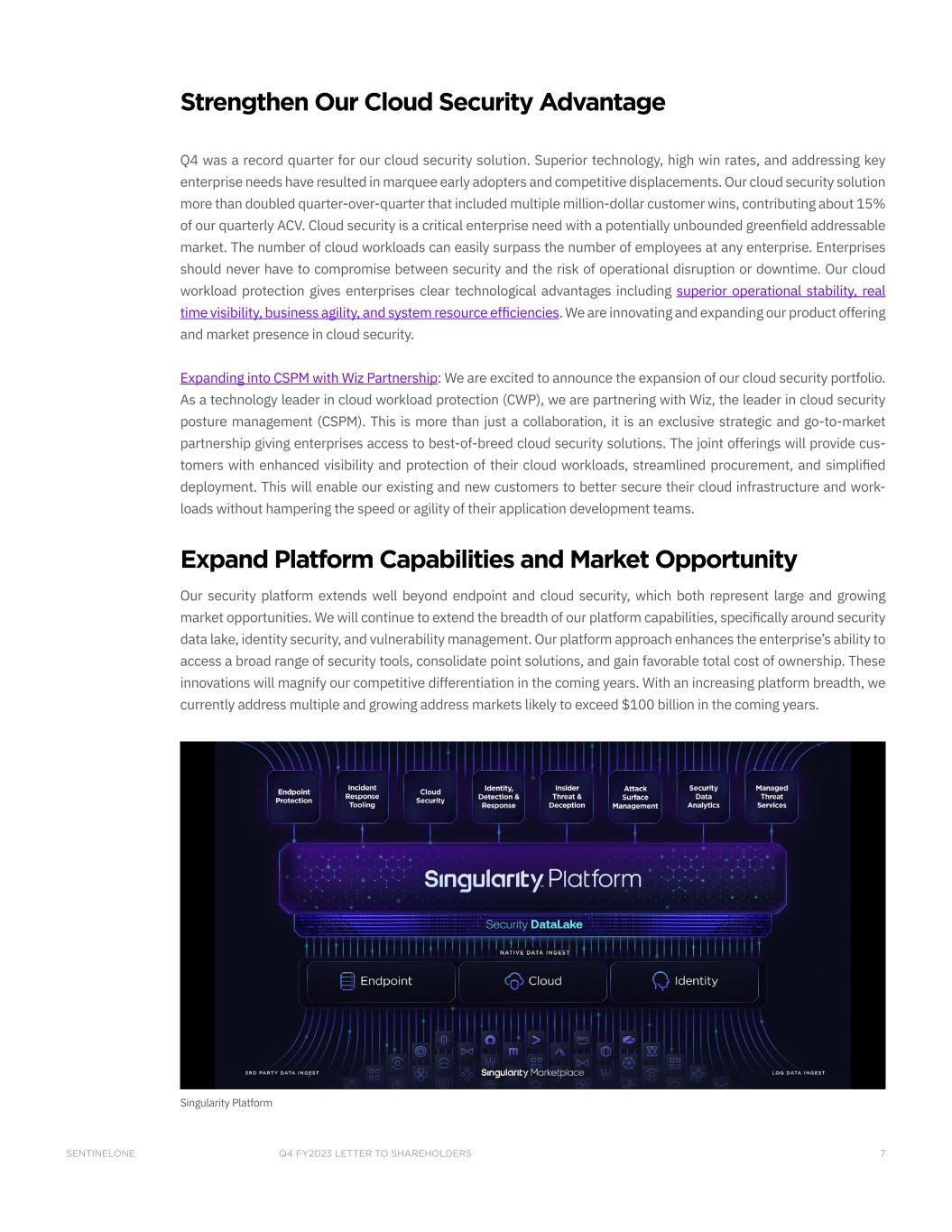 Q4 FY2023 LETTER TO SHAREHOLDERSSENTINELONE 7 Strengthen Our Cloud Security Advantage Q4 was a record quarter for our cloud security solution. Superior technology, high win rates, and addressing key enterprise needs have resulted in marquee early adopters and competitive displacements. Our cloud security solution more than doubled quarter-over-quarter that included multiple million-dollar customer wins, contributing about 15% of our quarterly ACV. Cloud security is a critical enterprise need with a potentially unbounded greenfield addressable market. The number of cloud workloads can easily surpass the number of employees at any enterprise. Enterprises should never have to compromise between security and the risk of operational disruption or downtime. Our cloud workload protection gives enterprises clear technological advantages including superior operational stability, real time visibility, business agility, and system resource efficiencies. We are innovating and expanding our product offering and market presence in cloud security. Expanding into CSPM with Wiz Partnership: We are excited to announce the expansion of our cloud security portfolio. As a technology leader in cloud workload protection (CWP), we are partnering with Wiz, the leader in cloud security posture management (CSPM). This is more than just a collaboration, it is an exclusive strategic and go-to-market partnership giving enterprises access to best-of-breed cloud security solutions. The joint offerings will provide cus- tomers with enhanced visibility and protection of their cloud workloads, streamlined procurement, and simplified deployment. This will enable our existing and new customers to better secure their cloud infrastructure and work- loads without hampering the speed or agility of their application development teams. Expand Platform Capabilities and Market Opportunity Our security platform extends well beyond endpoint and cloud security, which both represent large and growing market opportunities. We will continue to extend the breadth of our platform capabilities, specifically around security data lake, identity security, and vulnerability management. Our platform approach enhances the enterprise’s ability to access a broad range of security tools, consolidate point solutions, and gain favorable total cost of ownership. These innovations will magnify our competitive differentiation in the coming years. With an increasing platform breadth, we currently address multiple and growing address markets likely to exceed $100 billion in the coming years. Singularity Platform
