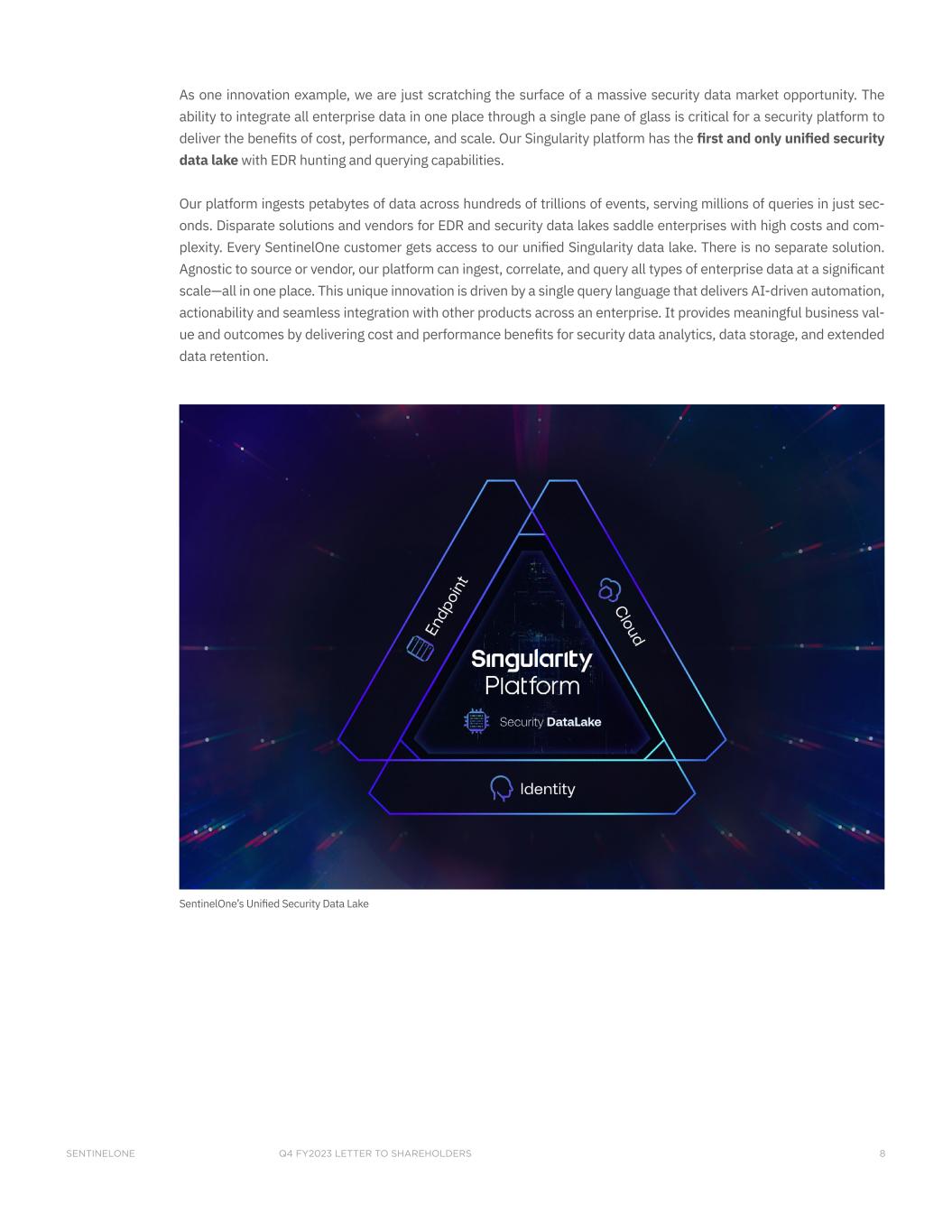 Q4 FY2023 LETTER TO SHAREHOLDERSSENTINELONE 8 As one innovation example, we are just scratching the surface of a massive security data market opportunity. The ability to integrate all enterprise data in one place through a single pane of glass is critical for a security platform to deliver the benefits of cost, performance, and scale. Our Singularity platform has the first and only unified security data lake with EDR hunting and querying capabilities. Our platform ingests petabytes of data across hundreds of trillions of events, serving millions of queries in just sec- onds. Disparate solutions and vendors for EDR and security data lakes saddle enterprises with high costs and com- plexity. Every SentinelOne customer gets access to our unified Singularity data lake. There is no separate solution. Agnostic to source or vendor, our platform can ingest, correlate, and query all types of enterprise data at a significant scale—all in one place. This unique innovation is driven by a single query language that delivers AI-driven automation, actionability and seamless integration with other products across an enterprise. It provides meaningful business val- ue and outcomes by delivering cost and performance benefits for security data analytics, data storage, and extended data retention. SentinelOne’s Unified Security Data Lake