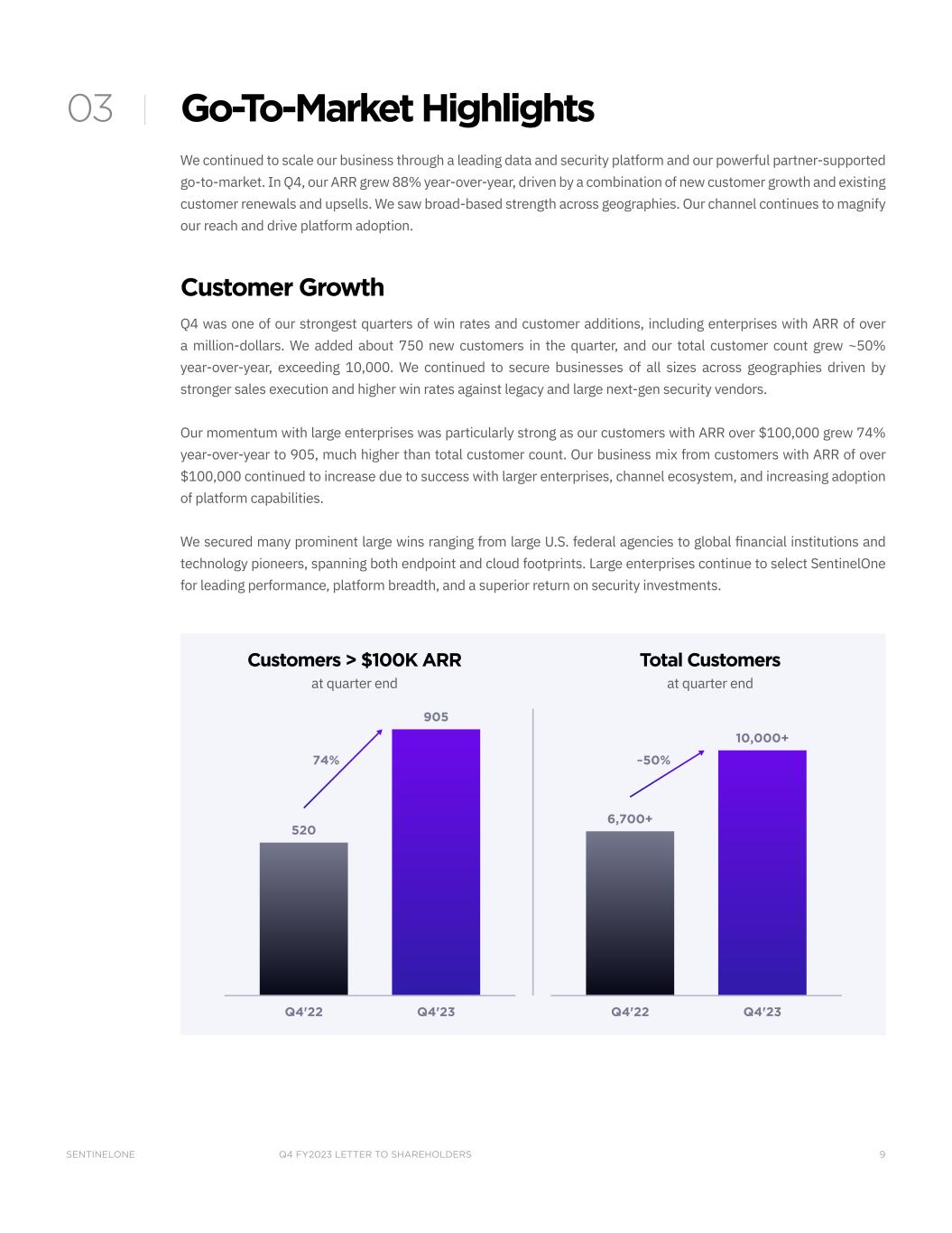 Q4 FY2023 LETTER TO SHAREHOLDERSSENTINELONE 9 Go-To-Market Highlights We continued to scale our business through a leading data and security platform and our powerful partner-supported go-to-market. In Q4, our ARR grew 88% year-over-year, driven by a combination of new customer growth and existing customer renewals and upsells. We saw broad-based strength across geographies. Our channel continues to magnify our reach and drive platform adoption. Customer Growth Q4 was one of our strongest quarters of win rates and customer additions, including enterprises with ARR of over a million-dollars. We added about 750 new customers in the quarter, and our total customer count grew ~50% year-over-year, exceeding 10,000. We continued to secure businesses of all sizes across geographies driven by stronger sales execution and higher win rates against legacy and large next-gen security vendors. Our momentum with large enterprises was particularly strong as our customers with ARR over $100,000 grew 74% year-over-year to 905, much higher than total customer count. Our business mix from customers with ARR of over $100,000 continued to increase due to success with larger enterprises, channel ecosystem, and increasing adoption of platform capabilities. We secured many prominent large wins ranging from large U.S. federal agencies to global financial institutions and technology pioneers, spanning both endpoint and cloud footprints. Large enterprises continue to select SentinelOne for leading performance, platform breadth, and a superior return on security investments. Customer Growth 520 Q4'22 74% 6,700+ Q4'22 905 Q4'23 10,000+ Q4'23 ~50% Customers > $100K ARR at quarter end Total Customers at quarter end 03