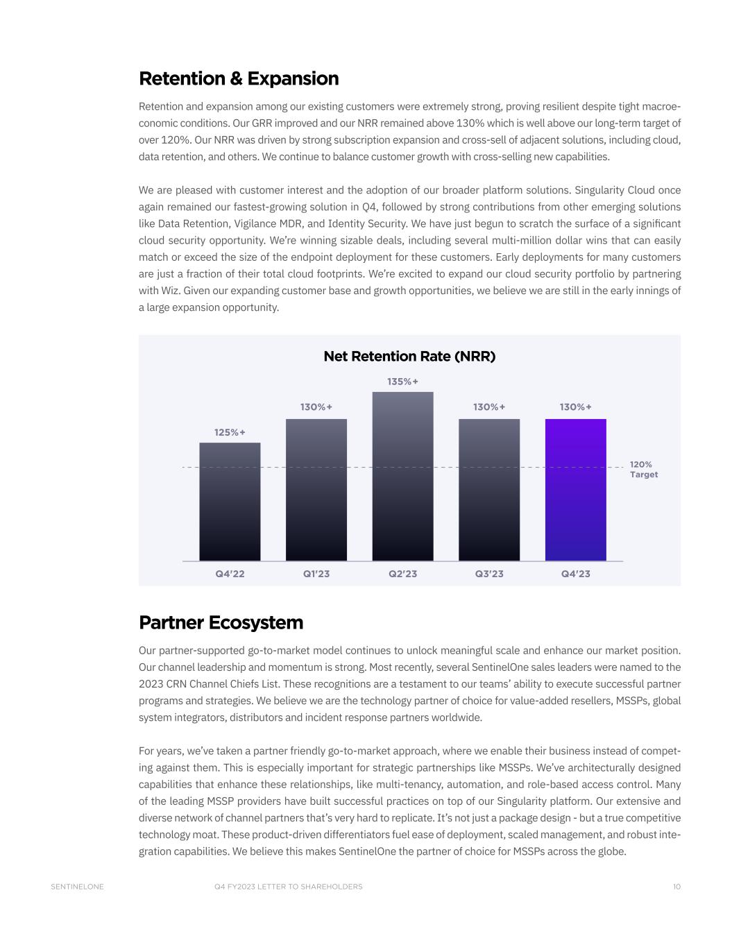 Q4 FY2023 LETTER TO SHAREHOLDERSSENTINELONE 10 Retention & Expansion Retention and expansion among our existing customers were extremely strong, proving resilient despite tight macroe- conomic conditions. Our GRR improved and our NRR remained above 130% which is well above our long-term target of over 120%. Our NRR was driven by strong subscription expansion and cross-sell of adjacent solutions, including cloud, data retention, and others. We continue to balance customer growth with cross-selling new capabilities. We are pleased with customer interest and the adoption of our broader platform solutions. Singularity Cloud once again remained our fastest-growing solution in Q4, followed by strong contributions from other emerging solutions like Data Retention, Vigilance MDR, and Identity Security. We have just begun to scratch the surface of a significant cloud security opportunity. We’re winning sizable deals, including several multi-million dollar wins that can easily match or exceed the size of the endpoint deployment for these customers. Early deployments for many customers are just a fraction of their total cloud footprints. We’re excited to expand our cloud security portfolio by partnering with Wiz. Given our expanding customer base and growth opportunities, we believe we are still in the early innings of a large expansion opportunity. 130%+ 130%+ 120% Target 130%+ 135%+ 125%+ Q4'22 Q1'23 Q2'23 Q3'23 Q4'23 Net Retention Rate (NRR) Partner Ecosystem Our partner-supported go-to-market model continues to unlock meaningful scale and enhance our market position. Our channel leadership and momentum is strong. Most recently, several SentinelOne sales leaders were named to the 2023 CRN Channel Chiefs List. These recognitions are a testament to our teams’ ability to execute successful partner programs and strategies. We believe we are the technology partner of choice for value-added resellers, MSSPs, global system integrators, distributors and incident response partners worldwide. For years, we’ve taken a partner friendly go-to-market approach, where we enable their business instead of compet- ing against them. This is especially important for strategic partnerships like MSSPs. We’ve architecturally designed capabilities that enhance these relationships, like multi-tenancy, automation, and role-based access control. Many of the leading MSSP providers have built successful practices on top of our Singularity platform. Our extensive and diverse network of channel partners that’s very hard to replicate. It’s not just a package design - but a true competitive technology moat. These product-driven differentiators fuel ease of deployment, scaled management, and robust inte- gration capabilities. We believe this makes SentinelOne the partner of choice for MSSPs across the globe.