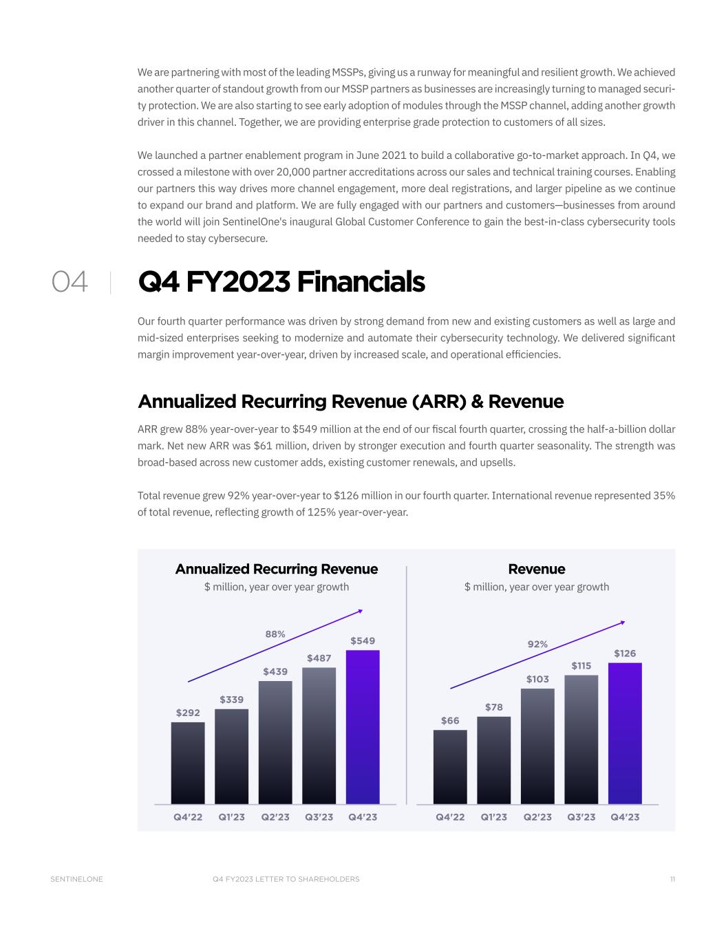 Q4 FY2023 LETTER TO SHAREHOLDERSSENTINELONE 11 We are partnering with most of the leading MSSPs, giving us a runway for meaningful and resilient growth. We achieved another quarter of standout growth from our MSSP partners as businesses are increasingly turning to managed securi- ty protection. We are also starting to see early adoption of modules through the MSSP channel, adding another growth driver in this channel. Together, we are providing enterprise grade protection to customers of all sizes. We launched a partner enablement program in June 2021 to build a collaborative go-to-market approach. In Q4, we crossed a milestone with over 20,000 partner accreditations across our sales and technical training courses. Enabling our partners this way drives more channel engagement, more deal registrations, and larger pipeline as we continue to expand our brand and platform. We are fully engaged with our partners and customers—businesses from around the world will join SentinelOne's inaugural Global Customer Conference to gain the best-in-class cybersecurity tools needed to stay cybersecure. Q4 FY2023 Financials Our fourth quarter performance was driven by strong demand from new and existing customers as well as large and mid-sized enterprises seeking to modernize and automate their cybersecurity technology. We delivered significant margin improvement year-over-year, driven by increased scale, and operational efficiencies. Annualized Recurring Revenue (ARR) & Revenue ARR grew 88% year-over-year to $549 million at the end of our fiscal fourth quarter, crossing the half-a-billion dollar mark. Net new ARR was $61 million, driven by stronger execution and fourth quarter seasonality. The strength was broad-based across new customer adds, existing customer renewals, and upsells. Total revenue grew 92% year-over-year to $126 million in our fourth quarter. International revenue represented 35% of total revenue, reflecting growth of 125% year-over-year. Annual Recurring Revenue Revenue $292 $339 $487 $115 $78 Q4'22 Q1'23 Q3'23Q2'23 Q4'22 Q1'23 Q3'23Q2'23 $439 $66 $103 $549 $126 Q4'23 Q4'23 88% 92% Annualized Recurring Revenue $ million, year over year growth Revenue $ million, year over year growth 04