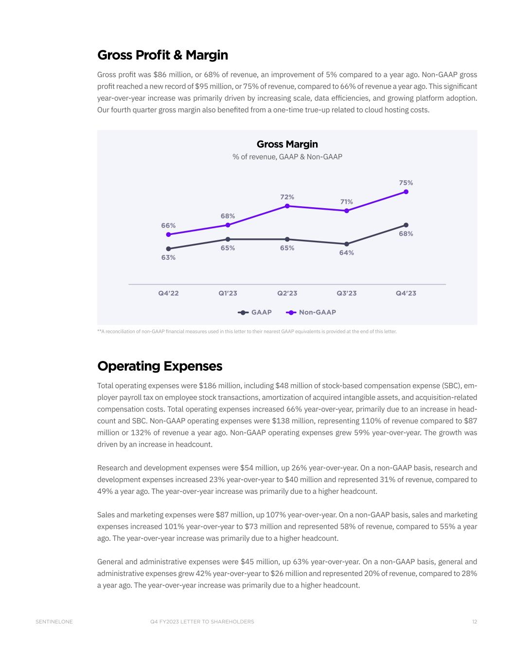 Q4 FY2023 LETTER TO SHAREHOLDERSSENTINELONE 12 Gross Profit & Margin Gross profit was $86 million, or 68% of revenue, an improvement of 5% compared to a year ago. Non-GAAP gross profit reached a new record of $95 million, or 75% of revenue, compared to 66% of revenue a year ago. This significant year-over-year increase was primarily driven by increasing scale, data efficiencies, and growing platform adoption. Our fourth quarter gross margin also benefited from a one-time true-up related to cloud hosting costs. Gross Margin GAAP Non-GAAP 63% 66% Q4'22 Q1'23 Q2'23 65% 68% 65% 72% Q3'23 64% 71% Q4'23 68% 75% Gross Margin % of revenue, GAAP & Non-GAAP **A reconciliation of non-GAAP financial measures used in this letter to their nearest GAAP equivalents is provided at the end of this letter. Operating Expenses Total operating expenses were $186 million, including $48 million of stock-based compensation expense (SBC), em- ployer payroll tax on employee stock transactions, amortization of acquired intangible assets, and acquisition-related compensation costs. Total operating expenses increased 66% year-over-year, primarily due to an increase in head- count and SBC. Non-GAAP operating expenses were $138 million, representing 110% of revenue compared to $87 million or 132% of revenue a year ago. Non-GAAP operating expenses grew 59% year-over-year. The growth was driven by an increase in headcount. Research and development expenses were $54 million, up 26% year-over-year. On a non-GAAP basis, research and development expenses increased 23% year-over-year to $40 million and represented 31% of revenue, compared to 49% a year ago. The year-over-year increase was primarily due to a higher headcount. Sales and marketing expenses were $87 million, up 107% year-over-year. On a non-GAAP basis, sales and marketing expenses increased 101% year-over-year to $73 million and represented 58% of revenue, compared to 55% a year ago. The year-over-year increase was primarily due to a higher headcount. General and administrative expenses were $45 million, up 63% year-over-year. On a non-GAAP basis, general and administrative expenses grew 42% year-over-year to $26 million and represented 20% of revenue, compared to 28% a year ago. The year-over-year increase was primarily due to a higher headcount.