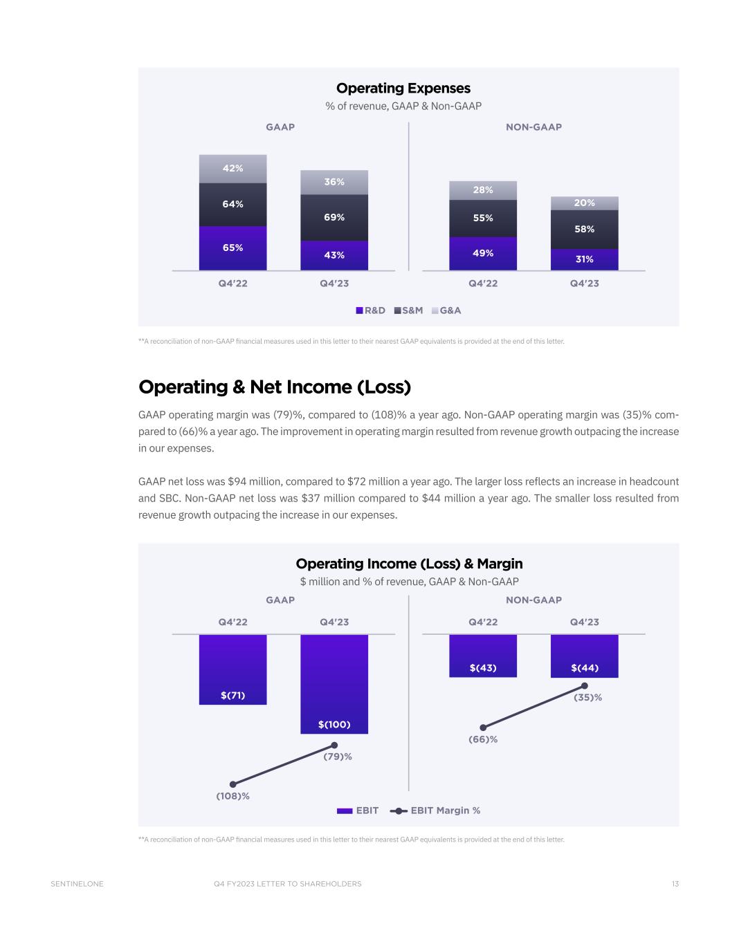 Q4 FY2023 LETTER TO SHAREHOLDERSSENTINELONE 13 GAAP NON-GAAP Q4'22 Q4'23 49% 31% 55% 58% 28% 20% Q4'22 Q4'23 65% 43% 64% 69% 42% 36% R&D S&M G&A Operating Expenses % of revenue, GAAP & Non-GAAP **A reconciliation of non-GAAP financial measures used in this letter to their nearest GAAP equivalents is provided at the end of this letter. Operating & Net Income (Loss) GAAP operating margin was (79)%, compared to (108)% a year ago. Non-GAAP operating margin was (35)% com- pared to (66)% a year ago. The improvement in operating margin resulted from revenue growth outpacing the increase in our expenses. GAAP net loss was $94 million, compared to $72 million a year ago. The larger loss reflects an increase in headcount and SBC. Non-GAAP net loss was $37 million compared to $44 million a year ago. The smaller loss resulted from revenue growth outpacing the increase in our expenses. $(71) $(100) Q4'22 Q4'23 EBIT EBIT Margin % $(43) $(44) Q4'22 Q4'23 GAAP NON-GAAP (66)% (35)% (79)% (108)% Operating Income (Loss) & Margin $ million and % of revenue, GAAP & Non-GAAP **A reconciliation of non-GAAP financial measures used in this letter to their nearest GAAP equivalents is provided at the end of this letter.