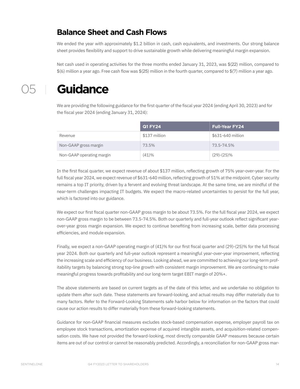 Q4 FY2023 LETTER TO SHAREHOLDERSSENTINELONE 14 Balance Sheet and Cash Flows We ended the year with approximately $1.2 billion in cash, cash equivalents, and investments. Our strong balance sheet provides flexibility and support to drive sustainable growth while delivering meaningful margin expansion. Net cash used in operating activities for the three months ended January 31, 2023, was $(22) million, compared to $(6) million a year ago. Free cash flow was $(25) million in the fourth quarter, compared to $(7) million a year ago. Guidance We are providing the following guidance for the first quarter of the fiscal year 2024 (ending April 30, 2023) and for the fiscal year 2024 (ending January 31, 2024): Q1 FY24 Full-Year FY24 Revenue $137 million $631-640 million Non-GAAP gross margin 73.5% 73.5-74.5% Non-GAAP operating margin (41)% (29)-(25)% In the first fiscal quarter, we expect revenue of about $137 million, reflecting growth of 75% year-over-year. For the full fiscal year 2024, we expect revenue of $631-640 million, reflecting growth of 51% at the midpoint. Cyber security remains a top IT priority, driven by a fervent and evolving threat landscape. At the same time, we are mindful of the near-term challenges impacting IT budgets. We expect the macro-related uncertainties to persist for the full year, which is factored into our guidance. We expect our first fiscal quarter non-GAAP gross margin to be about 73.5%. For the full fiscal year 2024, we expect non-GAAP gross margin to be between 73.5-74.5%. Both our quarterly and full-year outlook reflect significant year- over-year gross margin expansion. We expect to continue benefiting from increasing scale, better data processing efficiencies, and module expansion. Finally, we expect a non-GAAP operating margin of (41)% for our first fiscal quarter and (29)-(25)% for the full fiscal year 2024. Both our quarterly and full-year outlook represent a meaningful year-over-year improvement, reflecting the increasing scale and efficiency of our business. Looking ahead, we are committed to achieving our long-term prof- itability targets by balancing strong top-line growth with consistent margin improvement. We are continuing to make meaningful progress towards profitability and our long-term target EBIT margin of 20%+. The above statements are based on current targets as of the date of this letter, and we undertake no obligation to update them after such date. These statements are forward-looking, and actual results may differ materially due to many factors. Refer to the Forward-Looking Statements safe harbor below for information on the factors that could cause our action results to differ materially from these forward-looking statements. Guidance for non-GAAP financial measures excludes stock-based compensation expense, employer payroll tax on employee stock transactions, amortization expense of acquired intangible assets, and acquisition-related compen- sation costs. We have not provided the forward-looking, most directly comparable GAAP measures because certain items are out of our control or cannot be reasonably predicted. Accordingly, a reconciliation for non-GAAP gross mar- 05