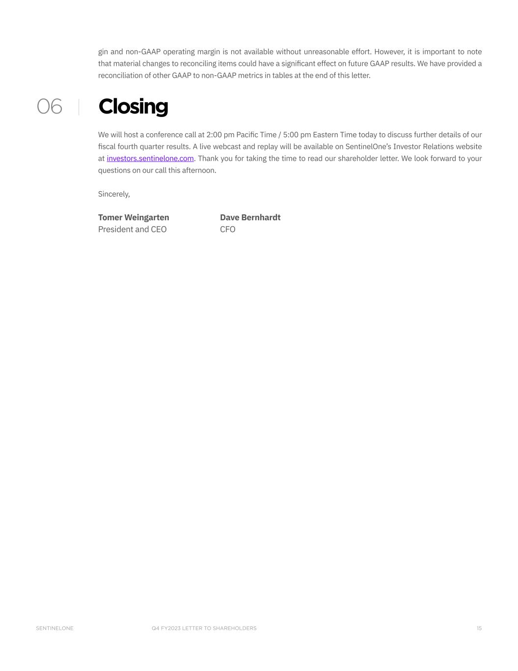 Q4 FY2023 LETTER TO SHAREHOLDERSSENTINELONE 15 gin and non-GAAP operating margin is not available without unreasonable effort. However, it is important to note that material changes to reconciling items could have a significant effect on future GAAP results. We have provided a reconciliation of other GAAP to non-GAAP metrics in tables at the end of this letter. Closing We will host a conference call at 2:00 pm Pacific Time / 5:00 pm Eastern Time today to discuss further details of our fiscal fourth quarter results. A live webcast and replay will be available on SentinelOne’s Investor Relations website at investors.sentinelone.com. Thank you for taking the time to read our shareholder letter. We look forward to your questions on our call this afternoon. Sincerely, Tomer Weingarten Dave Bernhardt President and CEO CFO 06
