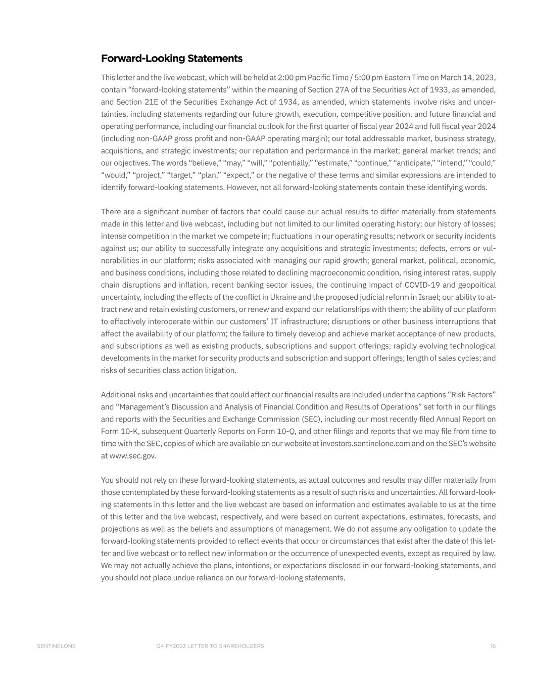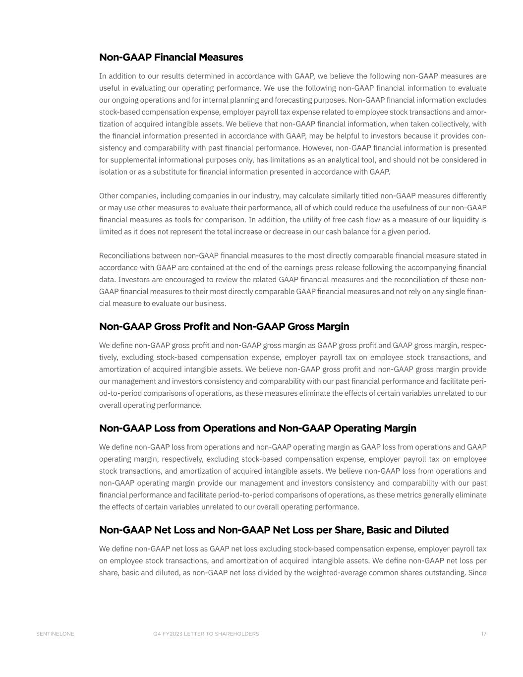 Q4 FY2023 LETTER TO SHAREHOLDERSSENTINELONE 17 Non-GAAP Financial Measures In addition to our results determined in accordance with GAAP, we believe the following non-GAAP measures are useful in evaluating our operating performance. We use the following non-GAAP financial information to evaluate our ongoing operations and for internal planning and forecasting purposes. Non-GAAP financial information excludes stock-based compensation expense, employer payroll tax expense related to employee stock transactions and amor- tization of acquired intangible assets. We believe that non-GAAP financial information, when taken collectively, with the financial information presented in accordance with GAAP, may be helpful to investors because it provides con- sistency and comparability with past financial performance. However, non-GAAP financial information is presented for supplemental informational purposes only, has limitations as an analytical tool, and should not be considered in isolation or as a substitute for financial information presented in accordance with GAAP. Other companies, including companies in our industry, may calculate similarly titled non-GAAP measures differently or may use other measures to evaluate their performance, all of which could reduce the usefulness of our non-GAAP financial measures as tools for comparison. In addition, the utility of free cash flow as a measure of our liquidity is limited as it does not represent the total increase or decrease in our cash balance for a given period. Reconciliations between non-GAAP financial measures to the most directly comparable financial measure stated in accordance with GAAP are contained at the end of the earnings press release following the accompanying financial data. Investors are encouraged to review the related GAAP financial measures and the reconciliation of these non- GAAP financial measures to their most directly comparable GAAP financial measures and not rely on any single finan- cial measure to evaluate our business. Non-GAAP Gross Profit and Non-GAAP Gross Margin We define non-GAAP gross profit and non-GAAP gross margin as GAAP gross profit and GAAP gross margin, respec- tively, excluding stock-based compensation expense, employer payroll tax on employee stock transactions, and amortization of acquired intangible assets. We believe non-GAAP gross profit and non-GAAP gross margin provide our management and investors consistency and comparability with our past financial performance and facilitate peri- od-to-period comparisons of operations, as these measures eliminate the effects of certain variables unrelated to our overall operating performance. Non-GAAP Loss from Operations and Non-GAAP Operating Margin We define non-GAAP loss from operations and non-GAAP operating margin as GAAP loss from operations and GAAP operating margin, respectively, excluding stock-based compensation expense, employer payroll tax on employee stock transactions, and amortization of acquired intangible assets. We believe non-GAAP loss from operations and non-GAAP operating margin provide our management and investors consistency and comparability with our past financial performance and facilitate period-to-period comparisons of operations, as these metrics generally eliminate the effects of certain variables unrelated to our overall operating performance. Non-GAAP Net Loss and Non-GAAP Net Loss per Share, Basic and Diluted We define non-GAAP net loss as GAAP net loss excluding stock-based compensation expense, employer payroll tax on employee stock transactions, and amortization of acquired intangible assets. We define non-GAAP net loss per share, basic and diluted, as non-GAAP net loss divided by the weighted-average common shares outstanding. Since