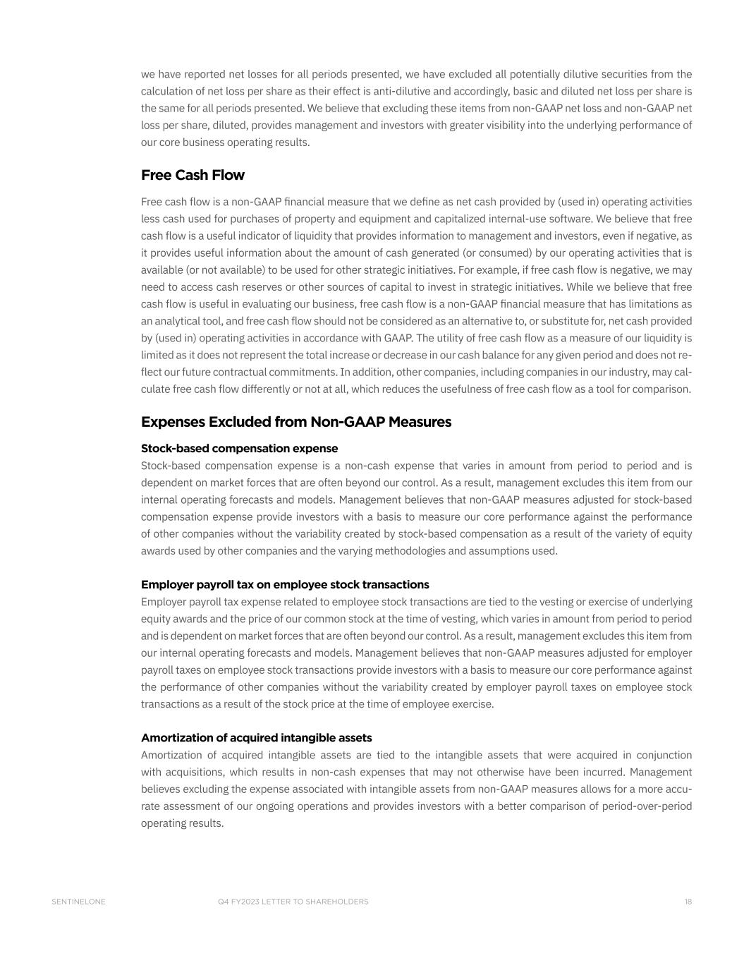 Q4 FY2023 LETTER TO SHAREHOLDERSSENTINELONE 18 we have reported net losses for all periods presented, we have excluded all potentially dilutive securities from the calculation of net loss per share as their effect is anti-dilutive and accordingly, basic and diluted net loss per share is the same for all periods presented. We believe that excluding these items from non-GAAP net loss and non-GAAP net loss per share, diluted, provides management and investors with greater visibility into the underlying performance of our core business operating results. Free Cash Flow Free cash flow is a non-GAAP financial measure that we define as net cash provided by (used in) operating activities less cash used for purchases of property and equipment and capitalized internal-use software. We believe that free cash flow is a useful indicator of liquidity that provides information to management and investors, even if negative, as it provides useful information about the amount of cash generated (or consumed) by our operating activities that is available (or not available) to be used for other strategic initiatives. For example, if free cash flow is negative, we may need to access cash reserves or other sources of capital to invest in strategic initiatives. While we believe that free cash flow is useful in evaluating our business, free cash flow is a non-GAAP financial measure that has limitations as an analytical tool, and free cash flow should not be considered as an alternative to, or substitute for, net cash provided by (used in) operating activities in accordance with GAAP. The utility of free cash flow as a measure of our liquidity is limited as it does not represent the total increase or decrease in our cash balance for any given period and does not re- flect our future contractual commitments. In addition, other companies, including companies in our industry, may cal- culate free cash flow differently or not at all, which reduces the usefulness of free cash flow as a tool for comparison. Expenses Excluded from Non-GAAP Measures Stock-based compensation expense Stock-based compensation expense is a non-cash expense that varies in amount from period to period and is dependent on market forces that are often beyond our control. As a result, management excludes this item from our internal operating forecasts and models. Management believes that non-GAAP measures adjusted for stock-based compensation expense provide investors with a basis to measure our core performance against the performance of other companies without the variability created by stock-based compensation as a result of the variety of equity awards used by other companies and the varying methodologies and assumptions used. Employer payroll tax on employee stock transactions Employer payroll tax expense related to employee stock transactions are tied to the vesting or exercise of underlying equity awards and the price of our common stock at the time of vesting, which varies in amount from period to period and is dependent on market forces that are often beyond our control. As a result, management excludes this item from our internal operating forecasts and models. Management believes that non-GAAP measures adjusted for employer payroll taxes on employee stock transactions provide investors with a basis to measure our core performance against the performance of other companies without the variability created by employer payroll taxes on employee stock transactions as a result of the stock price at the time of employee exercise. Amortization of acquired intangible assets Amortization of acquired intangible assets are tied to the intangible assets that were acquired in conjunction with acquisitions, which results in non-cash expenses that may not otherwise have been incurred. Management believes excluding the expense associated with intangible assets from non-GAAP measures allows for a more accu- rate assessment of our ongoing operations and provides investors with a better comparison of period-over-period operating results.