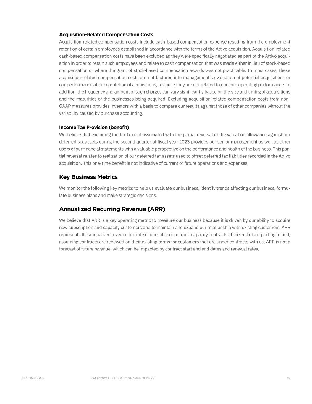 Q4 FY2023 LETTER TO SHAREHOLDERSSENTINELONE 19 Acquisition-Related Compensation Costs Acquisition-related compensation costs include cash-based compensation expense resulting from the employment retention of certain employees established in accordance with the terms of the Attivo acquisition. Acquisition-related cash-based compensation costs have been excluded as they were specifically negotiated as part of the Attivo acqui- sition in order to retain such employees and relate to cash compensation that was made either in lieu of stock-based compensation or where the grant of stock-based compensation awards was not practicable. In most cases, these acquisition-related compensation costs are not factored into management's evaluation of potential acquisitions or our performance after completion of acquisitions, because they are not related to our core operating performance. In addition, the frequency and amount of such charges can vary significantly based on the size and timing of acquisitions and the maturities of the businesses being acquired. Excluding acquisition-related compensation costs from non- GAAP measures provides investors with a basis to compare our results against those of other companies without the variability caused by purchase accounting. Income Tax Provision (benefit) We believe that excluding the tax benefit associated with the partial reversal of the valuation allowance against our deferred tax assets during the second quarter of fiscal year 2023 provides our senior management as well as other users of our financial statements with a valuable perspective on the performance and health of the business. This par- tial reversal relates to realization of our deferred tax assets used to offset deferred tax liabilities recorded in the Attivo acquisition. This one-time benefit is not indicative of current or future operations and expenses. Key Business Metrics We monitor the following key metrics to help us evaluate our business, identify trends affecting our business, formu- late business plans and make strategic decisions. Annualized Recurring Revenue (ARR) We believe that ARR is a key operating metric to measure our business because it is driven by our ability to acquire new subscription and capacity customers and to maintain and expand our relationship with existing customers. ARR represents the annualized revenue run rate of our subscription and capacity contracts at the end of a reporting period, assuming contracts are renewed on their existing terms for customers that are under contracts with us. ARR is not a forecast of future revenue, which can be impacted by contract start and end dates and renewal rates.