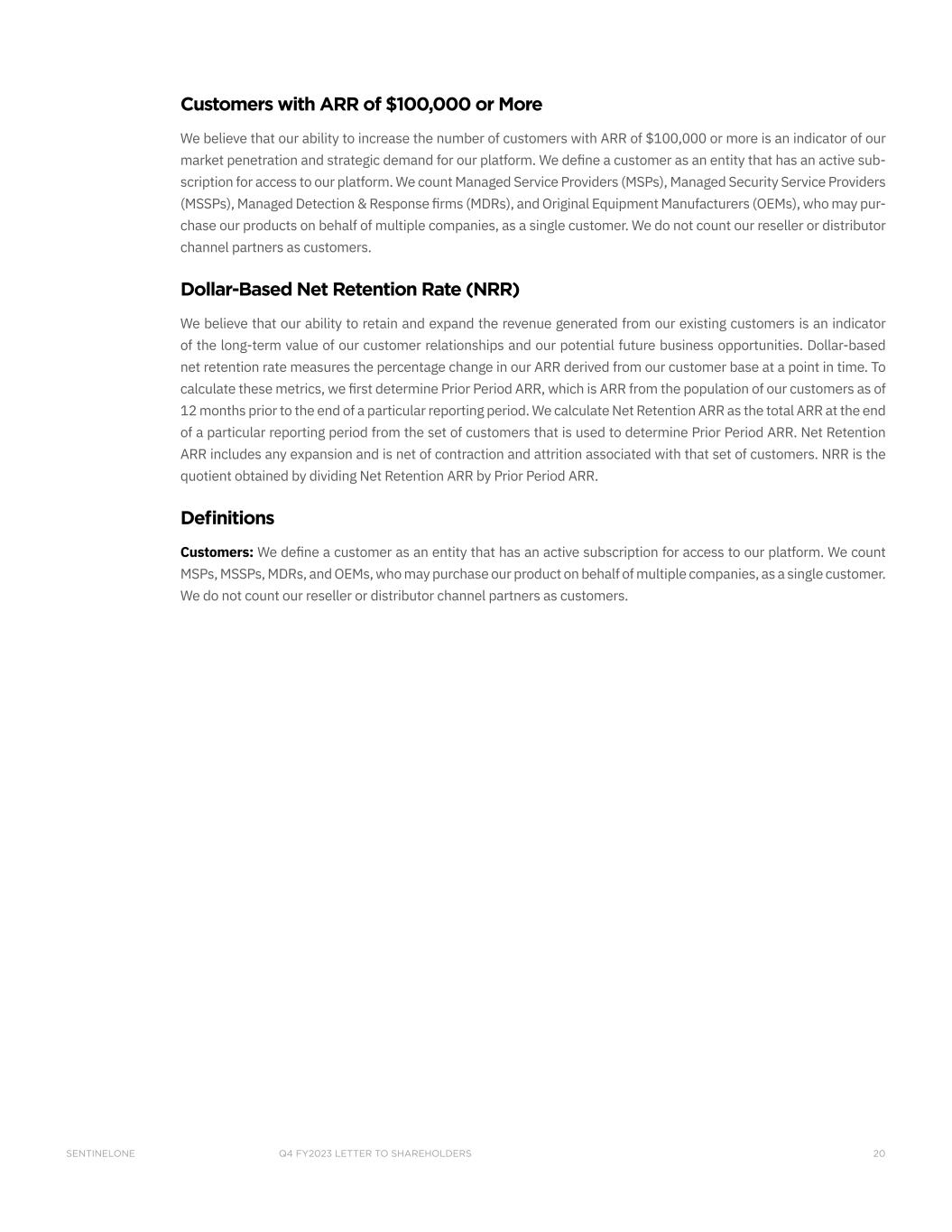 Q4 FY2023 LETTER TO SHAREHOLDERSSENTINELONE 20 Customers with ARR of $100,000 or More We believe that our ability to increase the number of customers with ARR of $100,000 or more is an indicator of our market penetration and strategic demand for our platform. We define a customer as an entity that has an active sub- scription for access to our platform. We count Managed Service Providers (MSPs), Managed Security Service Providers (MSSPs), Managed Detection & Response firms (MDRs), and Original Equipment Manufacturers (OEMs), who may pur- chase our products on behalf of multiple companies, as a single customer. We do not count our reseller or distributor channel partners as customers. Dollar-Based Net Retention Rate (NRR) We believe that our ability to retain and expand the revenue generated from our existing customers is an indicator of the long-term value of our customer relationships and our potential future business opportunities. Dollar-based net retention rate measures the percentage change in our ARR derived from our customer base at a point in time. To calculate these metrics, we first determine Prior Period ARR, which is ARR from the population of our customers as of 12 months prior to the end of a particular reporting period. We calculate Net Retention ARR as the total ARR at the end of a particular reporting period from the set of customers that is used to determine Prior Period ARR. Net Retention ARR includes any expansion and is net of contraction and attrition associated with that set of customers. NRR is the quotient obtained by dividing Net Retention ARR by Prior Period ARR. Definitions Customers: We define a customer as an entity that has an active subscription for access to our platform. We count MSPs, MSSPs, MDRs, and OEMs, who may purchase our product on behalf of multiple companies, as a single customer. We do not count our reseller or distributor channel partners as customers.