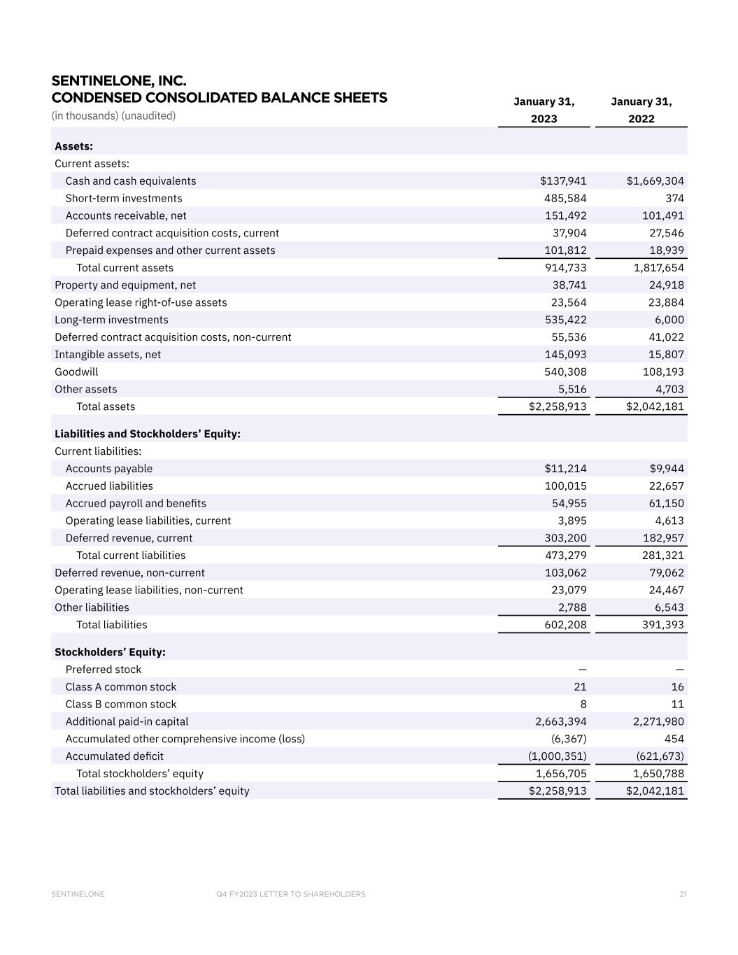 Q4 FY2023 LETTER TO SHAREHOLDERSSENTINELONE 21 January 31, January 31, 2023 2022 Assets: Current assets: Cash and cash equivalents $137,941 $1,669,304 Short-term investments 485,584 374 Accounts receivable, net 151,492 101,491 Deferred contract acquisition costs, current 37,904 27,546 Prepaid expenses and other current assets 101,812 18,939 Total current assets 914,733 1,817,654 Property and equipment, net 38,741 24,918 Operating lease right-of-use assets 23,564 23,884 Long-term investments 535,422 6,000 Deferred contract acquisition costs, non-current 55,536 41,022 Intangible assets, net 145,093 15,807 Goodwill 540,308 108,193 Other assets 5,516 4,703 Total assets $2,258,913 $2,042,181 Liabilities and Stockholders’ Equity: Current liabilities: Accounts payable $11,214 $9,944 Accrued liabilities 100,015 22,657 Accrued payroll and benefits 54,955 61,150 Operating lease liabilities, current 3,895 4,613 Deferred revenue, current 303,200 182,957 Total current liabilities 473,279 281,321 Deferred revenue, non-current 103,062 79,062 Operating lease liabilities, non-current 23,079 24,467 Other liabilities 2,788 6,543 Total liabilities 602,208 391,393 Stockholders’ Equity: Preferred stock — — Class A common stock 21 16 Class B common stock 8 11 Additional paid-in capital 2,663,394 2,271,980 Accumulated other comprehensive income (loss) (6,367) 454 Accumulated deficit (1,000,351) (621,673) Total stockholders’ equity 1,656,705 1,650,788 Total liabilities and stockholders’ equity $2,258,913 $2,042,181 SENTINELONE, INC. CONDENSED CONSOLIDATED BALANCE SHEETS (in thousands) (unaudited)