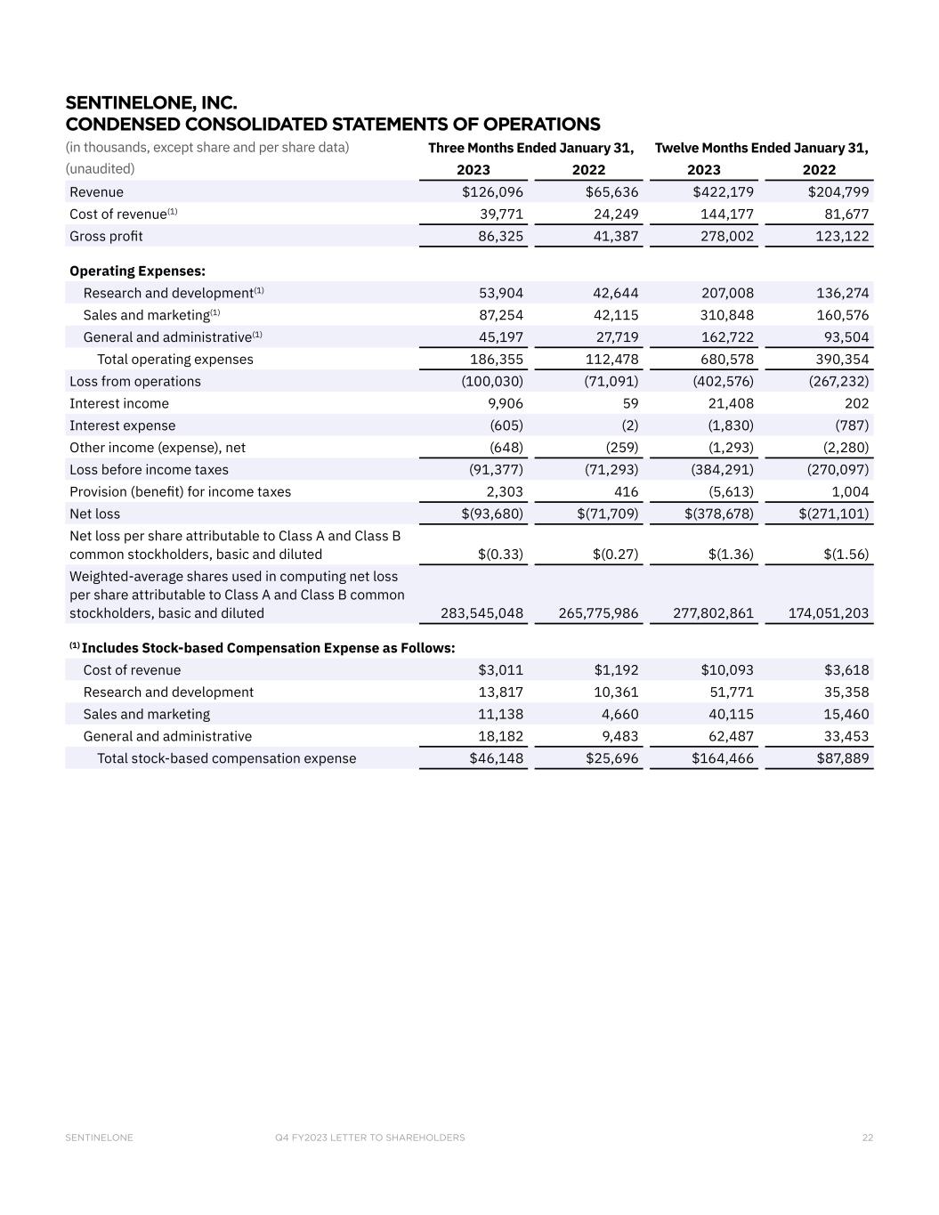 Q4 FY2023 LETTER TO SHAREHOLDERSSENTINELONE 22 Three Months Ended January 31, Twelve Months Ended January 31, 2023 2022 2023 2022 Revenue $126,096 $65,636 $422,179 $204,799 Cost of revenue(1) 39,771 24,249 144,177 81,677 Gross profit 86,325 41,387 278,002 123,122 Operating Expenses: Research and development(1) 53,904 42,644 207,008 136,274 Sales and marketing(1) 87,254 42,115 310,848 160,576 General and administrative(1) 45,197 27,719 162,722 93,504 Total operating expenses 186,355 112,478 680,578 390,354 Loss from operations (100,030) (71,091) (402,576) (267,232) Interest income 9,906 59 21,408 202 Interest expense (605) (2) (1,830) (787) Other income (expense), net (648) (259) (1,293) (2,280) Loss before income taxes (91,377) (71,293) (384,291) (270,097) Provision (benefit) for income taxes 2,303 416 (5,613) 1,004 Net loss $(93,680) $(71,709) $(378,678) $(271,101) Net loss per share attributable to Class A and Class B common stockholders, basic and diluted $(0.33) $(0.27) $(1.36) $(1.56) Weighted-average shares used in computing net loss per share attributable to Class A and Class B common stockholders, basic and diluted 283,545,048 265,775,986 277,802,861 174,051,203 (1) Includes Stock-based Compensation Expense as Follows: Cost of revenue $3,011 $1,192 $10,093 $3,618 Research and development 13,817 10,361 51,771 35,358 Sales and marketing 11,138 4,660 40,115 15,460 General and administrative 18,182 9,483 62,487 33,453 Total stock-based compensation expense $46,148 $25,696 $164,466 $87,889 SENTINELONE, INC. CONDENSED CONSOLIDATED STATEMENTS OF OPERATIONS (in thousands, except share and per share data) (unaudited)