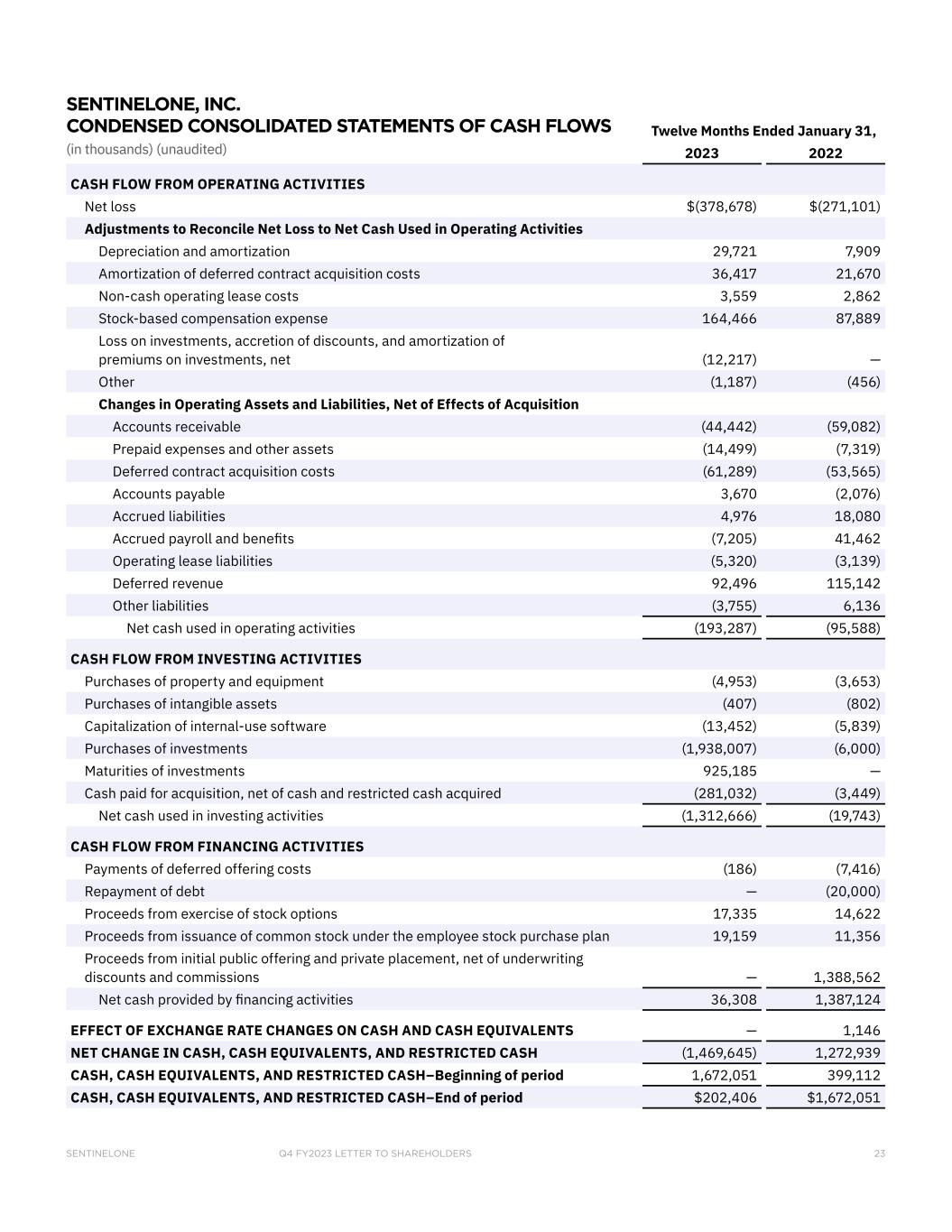 Q4 FY2023 LETTER TO SHAREHOLDERSSENTINELONE 23 Twelve Months Ended January 31, 2023 2022 CASH FLOW FROM OPERATING ACTIVITIES Net loss $(378,678) $(271,101) Adjustments to Reconcile Net Loss to Net Cash Used in Operating Activities Depreciation and amortization 29,721 7,909 Amortization of deferred contract acquisition costs 36,417 21,670 Non-cash operating lease costs 3,559 2,862 Stock-based compensation expense 164,466 87,889 Loss on investments, accretion of discounts, and amortization of premiums on investments, net (12,217) — Other (1,187) (456) Changes in Operating Assets and Liabilities, Net of Effects of Acquisition Accounts receivable (44,442) (59,082) Prepaid expenses and other assets (14,499) (7,319) Deferred contract acquisition costs (61,289) (53,565) Accounts payable 3,670 (2,076) Accrued liabilities 4,976 18,080 Accrued payroll and benefits (7,205) 41,462 Operating lease liabilities (5,320) (3,139) Deferred revenue 92,496 115,142 Other liabilities (3,755) 6,136 Net cash used in operating activities (193,287) (95,588) CASH FLOW FROM INVESTING ACTIVITIES Purchases of property and equipment (4,953) (3,653) Purchases of intangible assets (407) (802) Capitalization of internal-use software (13,452) (5,839) Purchases of investments (1,938,007) (6,000) Maturities of investments 925,185 — Cash paid for acquisition, net of cash and restricted cash acquired (281,032) (3,449) Net cash used in investing activities (1,312,666) (19,743) CASH FLOW FROM FINANCING ACTIVITIES Payments of deferred offering costs (186) (7,416) Repayment of debt — (20,000) Proceeds from exercise of stock options 17,335 14,622 Proceeds from issuance of common stock under the employee stock purchase plan 19,159 11,356 Proceeds from initial public offering and private placement, net of underwriting discounts and commissions — 1,388,562 Net cash provided by financing activities 36,308 1,387,124 EFFECT OF EXCHANGE RATE CHANGES ON CASH AND CASH EQUIVALENTS — 1,146 NET CHANGE IN CASH, CASH EQUIVALENTS, AND RESTRICTED CASH (1,469,645) 1,272,939 CASH, CASH EQUIVALENTS, AND RESTRICTED CASH–Beginning of period 1,672,051 399,112 CASH, CASH EQUIVALENTS, AND RESTRICTED CASH–End of period $202,406 $1,672,051 SENTINELONE, INC. CONDENSED CONSOLIDATED STATEMENTS OF CASH FLOWS (in thousands) (unaudited)