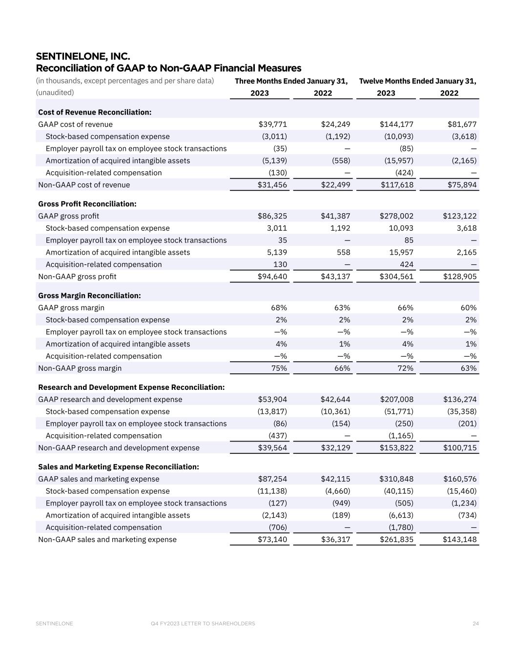Q4 FY2023 LETTER TO SHAREHOLDERSSENTINELONE 24 Three Months Ended January 31, Twelve Months Ended January 31, 2023 2022 2023 2022 Cost of Revenue Reconciliation: GAAP cost of revenue $39,771 $24,249 $144,177 $81,677 Stock-based compensation expense (3,011) (1,192) (10,093) (3,618) Employer payroll tax on employee stock transactions (35) — (85) — Amortization of acquired intangible assets (5,139) (558) (15,957) (2,165) Acquisition-related compensation (130) — (424) — Non-GAAP cost of revenue $31,456 $22,499 $117,618 $75,894 Gross Profit Reconciliation: GAAP gross profit $86,325 $41,387 $278,002 $123,122 Stock-based compensation expense 3,011 1,192 10,093 3,618 Employer payroll tax on employee stock transactions 35 — 85 — Amortization of acquired intangible assets 5,139 558 15,957 2,165 Acquisition-related compensation 130 — 424 — Non-GAAP gross profit $94,640 $43,137 $304,561 $128,905 Gross Margin Reconciliation: GAAP gross margin 68% 63% 66% 60% Stock-based compensation expense 2% 2% 2% 2% Employer payroll tax on employee stock transactions —% —% —% —% Amortization of acquired intangible assets 4% 1% 4% 1% Acquisition-related compensation —% —% —% —% Non-GAAP gross margin 75% 66% 72% 63% Research and Development Expense Reconciliation: GAAP research and development expense $53,904 $42,644 $207,008 $136,274 Stock-based compensation expense (13,817) (10,361) (51,771) (35,358) Employer payroll tax on employee stock transactions (86) (154) (250) (201) Acquisition-related compensation (437) — (1,165) — Non-GAAP research and development expense $39,564 $32,129 $153,822 $100,715 Sales and Marketing Expense Reconciliation: GAAP sales and marketing expense $87,254 $42,115 $310,848 $160,576 Stock-based compensation expense (11,138) (4,660) (40,115) (15,460) Employer payroll tax on employee stock transactions (127) (949) (505) (1,234) Amortization of acquired intangible assets (2,143) (189) (6,613) (734) Acquisition-related compensation (706) — (1,780) — Non-GAAP sales and marketing expense $73,140 $36,317 $261,835 $143,148 SENTINELONE, INC. Reconciliation of GAAP to Non-GAAP Financial Measures (in thousands, except percentages and per share data) (unaudited)