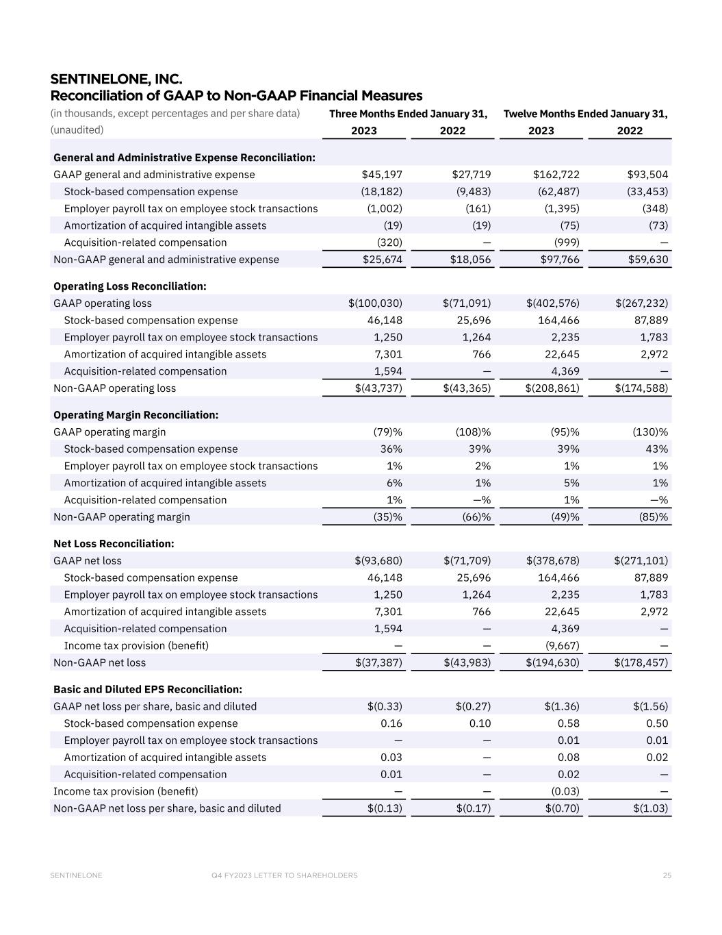 Q4 FY2023 LETTER TO SHAREHOLDERSSENTINELONE 25 Three Months Ended January 31, Twelve Months Ended January 31, 2023 2022 2023 2022 General and Administrative Expense Reconciliation: GAAP general and administrative expense $45,197 $27,719 $162,722 $93,504 Stock-based compensation expense (18,182) (9,483) (62,487) (33,453) Employer payroll tax on employee stock transactions (1,002) (161) (1,395) (348) Amortization of acquired intangible assets (19) (19) (75) (73) Acquisition-related compensation (320) — (999) — Non-GAAP general and administrative expense $25,674 $18,056 $97,766 $59,630 Operating Loss Reconciliation: GAAP operating loss $(100,030) $(71,091) $(402,576) $(267,232) Stock-based compensation expense 46,148 25,696 164,466 87,889 Employer payroll tax on employee stock transactions 1,250 1,264 2,235 1,783 Amortization of acquired intangible assets 7,301 766 22,645 2,972 Acquisition-related compensation 1,594 — 4,369 — Non-GAAP operating loss $(43,737) $(43,365) $(208,861) $(174,588) Operating Margin Reconciliation: GAAP operating margin (79)% (108)% (95)% (130)% Stock-based compensation expense 36% 39% 39% 43% Employer payroll tax on employee stock transactions 1% 2% 1% 1% Amortization of acquired intangible assets 6% 1% 5% 1% Acquisition-related compensation 1% —% 1% —% Non-GAAP operating margin (35)% (66)% (49)% (85)% Net Loss Reconciliation: GAAP net loss $(93,680) $(71,709) $(378,678) $(271,101) Stock-based compensation expense 46,148 25,696 164,466 87,889 Employer payroll tax on employee stock transactions 1,250 1,264 2,235 1,783 Amortization of acquired intangible assets 7,301 766 22,645 2,972 Acquisition-related compensation 1,594 — 4,369 — Income tax provision (benefit) — — (9,667) — Non-GAAP net loss $(37,387) $(43,983) $(194,630) $(178,457) Basic and Diluted EPS Reconciliation: GAAP net loss per share, basic and diluted $(0.33) $(0.27) $(1.36) $(1.56) Stock-based compensation expense 0.16 0.10 0.58 0.50 Employer payroll tax on employee stock transactions — — 0.01 0.01 Amortization of acquired intangible assets 0.03 — 0.08 0.02 Acquisition-related compensation 0.01 — 0.02 — Income tax provision (benefit) — — (0.03) — Non-GAAP net loss per share, basic and diluted $(0.13) $(0.17) $(0.70) $(1.03) SENTINELONE, INC. Reconciliation of GAAP to Non-GAAP Financial Measures (in thousands, except percentages and per share data) (unaudited)