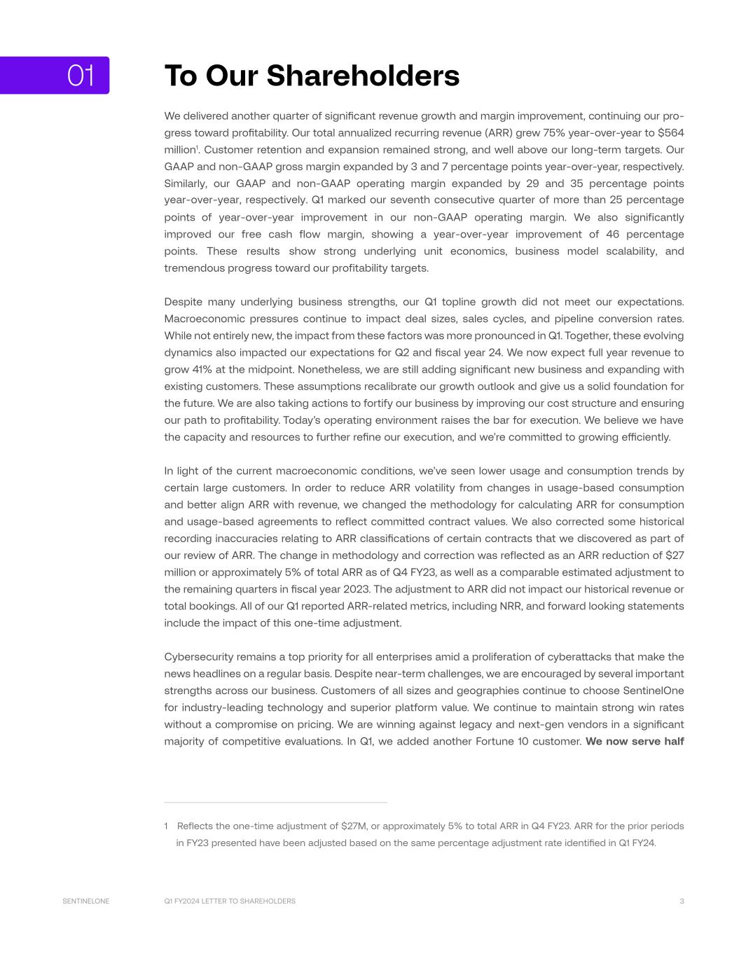 Q1 FY2024 LETTER TO SHAREHOLDERS 3SENTINELONE To Our Shareholders We delivered another quarter of significant revenue growth and margin improvement, continuing our pro- gress toward profitability. Our total annualized recurring revenue (ARR) grew 75% year-over-year to $564 million1. Customer retention and expansion remained strong, and well above our long-term targets. Our GAAP and non-GAAP gross margin expanded by 3 and 7 percentage points year-over-year, respectively. Similarly, our GAAP and non-GAAP operating margin expanded by 29 and 35 percentage points year-over-year, respectively. Q1 marked our seventh consecutive quarter of more than 25 percentage points of year-over-year improvement in our non-GAAP operating margin. We also significantly improved our free cash flow margin, showing a year-over-year improvement of 46 percentage points. These results show strong underlying unit economics, business model scalability, and tremendous progress toward our profitability targets. Despite many underlying business strengths, our Q1 topline growth did not meet our expectations. Macroeconomic pressures continue to impact deal sizes, sales cycles, and pipeline conversion rates. While not entirely new, the impact from these factors was more pronounced in Q1. Together, these evolving dynamics also impacted our expectations for Q2 and fiscal year 24. We now expect full year revenue to grow 41% at the midpoint. Nonetheless, we are still adding significant new business and expanding with existing customers. These assumptions recalibrate our growth outlook and give us a solid foundation for the future. We are also taking actions to fortify our business by improving our cost structure and ensuring our path to profitability. Today’s operating environment raises the bar for execution. We believe we have the capacity and resources to further refine our execution, and we’re committed to growing efficiently. In light of the current macroeconomic conditions, we’ve seen lower usage and consumption trends by certain large customers. In order to reduce ARR volatility from changes in usage-based consumption and better align ARR with revenue, we changed the methodology for calculating ARR for consumption and usage-based agreements to reflect committed contract values. We also corrected some historical recording inaccuracies relating to ARR classifications of certain contracts that we discovered as part of our review of ARR. The change in methodology and correction was reflected as an ARR reduction of $27 million or approximately 5% of total ARR as of Q4 FY23, as well as a comparable estimated adjustment to the remaining quarters in fiscal year 2023. The adjustment to ARR did not impact our historical revenue or total bookings. All of our Q1 reported ARR-related metrics, including NRR, and forward looking statements include the impact of this one-time adjustment. Cybersecurity remains a top priority for all enterprises amid a proliferation of cyberattacks that make the news headlines on a regular basis. Despite near-term challenges, we are encouraged by several important strengths across our business. Customers of all sizes and geographies continue to choose SentinelOne for industry-leading technology and superior platform value. We continue to maintain strong win rates without a compromise on pricing. We are winning against legacy and next-gen vendors in a significant majority of competitive evaluations. In Q1, we added another Fortune 10 customer. We now serve half 1 Reflects the one-time adjustment of $27M, or approximately 5% to total ARR in Q4 FY23. ARR for the prior periods in FY23 presented have been adjusted based on the same percentage adjustment rate identified in Q1 FY24. 01