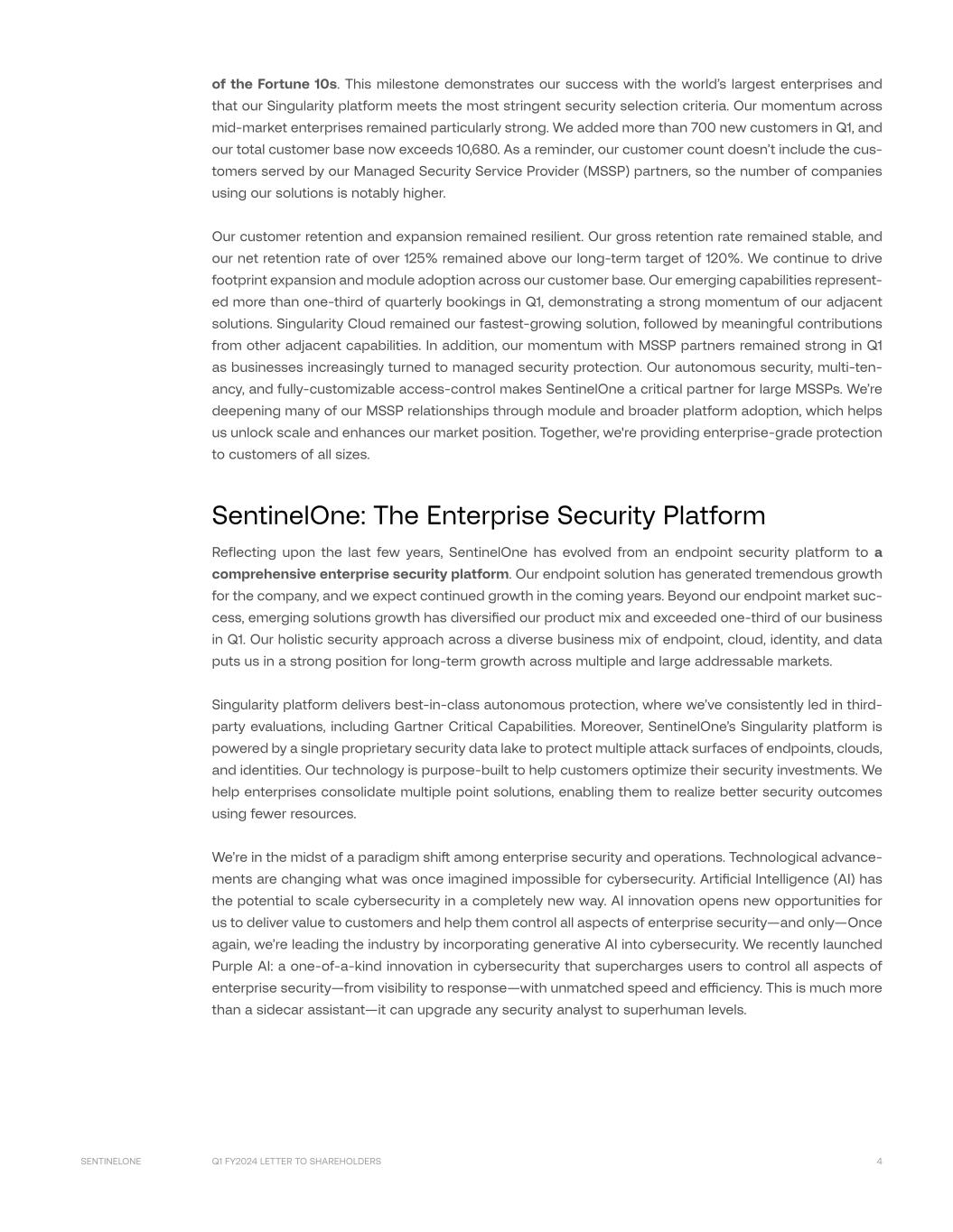 Q1 FY2024 LETTER TO SHAREHOLDERS 4SENTINELONE of the Fortune 10s. This milestone demonstrates our success with the world’s largest enterprises and that our Singularity platform meets the most stringent security selection criteria. Our momentum across mid-market enterprises remained particularly strong. We added more than 700 new customers in Q1, and our total customer base now exceeds 10,680. As a reminder, our customer count doesn’t include the cus- tomers served by our Managed Security Service Provider (MSSP) partners, so the number of companies using our solutions is notably higher. Our customer retention and expansion remained resilient. Our gross retention rate remained stable, and our net retention rate of over 125% remained above our long-term target of 120%. We continue to drive footprint expansion and module adoption across our customer base. Our emerging capabilities represent- ed more than one-third of quarterly bookings in Q1, demonstrating a strong momentum of our adjacent solutions. Singularity Cloud remained our fastest-growing solution, followed by meaningful contributions from other adjacent capabilities. In addition, our momentum with MSSP partners remained strong in Q1 as businesses increasingly turned to managed security protection. Our autonomous security, multi-ten- ancy, and fully-customizable access-control makes SentinelOne a critical partner for large MSSPs. We’re deepening many of our MSSP relationships through module and broader platform adoption, which helps us unlock scale and enhances our market position. Together, we're providing enterprise-grade protection to customers of all sizes. SentinelOne: The Enterprise Security Platform Reflecting upon the last few years, SentinelOne has evolved from an endpoint security platform to a comprehensive enterprise security platform. Our endpoint solution has generated tremendous growth for the company, and we expect continued growth in the coming years. Beyond our endpoint market suc- cess, emerging solutions growth has diversified our product mix and exceeded one-third of our business in Q1. Our holistic security approach across a diverse business mix of endpoint, cloud, identity, and data puts us in a strong position for long-term growth across multiple and large addressable markets. Singularity platform delivers best-in-class autonomous protection, where we’ve consistently led in third- party evaluations, including Gartner Critical Capabilities. Moreover, SentinelOne’s Singularity platform is powered by a single proprietary security data lake to protect multiple attack surfaces of endpoints, clouds, and identities. Our technology is purpose-built to help customers optimize their security investments. We help enterprises consolidate multiple point solutions, enabling them to realize better security outcomes using fewer resources. We’re in the midst of a paradigm shift among enterprise security and operations. Technological advance- ments are changing what was once imagined impossible for cybersecurity. Artificial Intelligence (AI) has the potential to scale cybersecurity in a completely new way. AI innovation opens new opportunities for us to deliver value to customers and help them control all aspects of enterprise security—and only—Once again, we’re leading the industry by incorporating generative AI into cybersecurity. We recently launched Purple AI: a one-of-a-kind innovation in cybersecurity that supercharges users to control all aspects of enterprise security—from visibility to response—with unmatched speed and efficiency. This is much more than a sidecar assistant—it can upgrade any security analyst to superhuman levels.