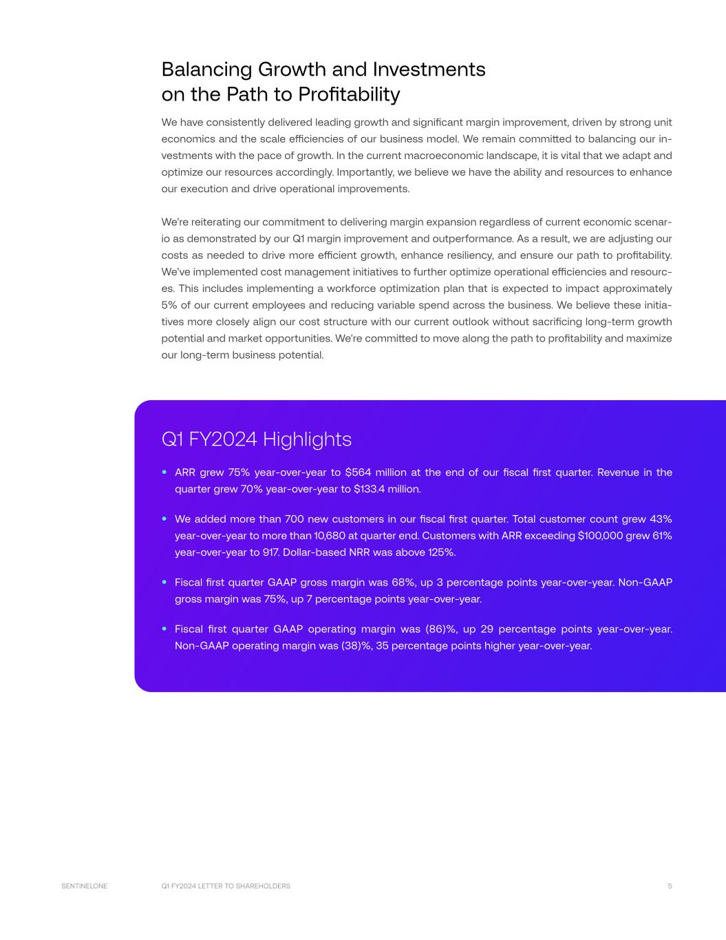 Q1 FY2024 LETTER TO SHAREHOLDERS 5SENTINELONE Balancing Growth and Investments on the Path to Profitability We have consistently delivered leading growth and significant margin improvement, driven by strong unit economics and the scale efficiencies of our business model. We remain committed to balancing our in- vestments with the pace of growth. In the current macroeconomic landscape, it is vital that we adapt and optimize our resources accordingly. Importantly, we believe we have the ability and resources to enhance our execution and drive operational improvements. We’re reiterating our commitment to delivering margin expansion regardless of current economic scenar- io as demonstrated by our Q1 margin improvement and outperformance. As a result, we are adjusting our costs as needed to drive more efficient growth, enhance resiliency, and ensure our path to profitability. We’ve implemented cost management initiatives to further optimize operational efficiencies and resourc- es. This includes implementing a workforce optimization plan that is expected to impact approximately 5% of our current employees and reducing variable spend across the business. We believe these initia- tives more closely align our cost structure with our current outlook without sacrificing long-term growth potential and market opportunities. We’re committed to move along the path to profitability and maximize our long-term business potential. Q1 FY2024 Highlights • ARR grew 75% year-over-year to $564 million at the end of our fiscal first quarter. Revenue in the quarter grew 70% year-over-year to $133.4 million. • We added more than 700 new customers in our fiscal first quarter. Total customer count grew 43% year-over-year to more than 10,680 at quarter end. Customers with ARR exceeding $100,000 grew 61% year-over-year to 917. Dollar-based NRR was above 125%. • Fiscal first quarter GAAP gross margin was 68%, up 3 percentage points year-over-year. Non-GAAP gross margin was 75%, up 7 percentage points year-over-year. • Fiscal first quarter GAAP operating margin was (86)%, up 29 percentage points year-over-year. Non-GAAP operating margin was (38)%, 35 percentage points higher year-over-year.
