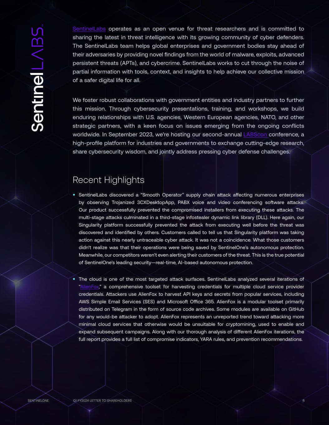 Q1 FY2024 LETTER TO SHAREHOLDERS 6SENTINELONE SentinelLabs operates as an open venue for threat researchers and is committed to sharing the latest in threat intelligence with its growing community of cyber defenders. The SentinelLabs team helps global enterprises and government bodies stay ahead of their adversaries by providing novel findings from the world of malware, exploits, advanced persistent threats (APTs), and cybercrime. SentinelLabs works to cut through the noise of partial information with tools, context, and insights to help achieve our collective mission of a safer digital life for all. We foster robust collaborations with government entities and industry partners to further this mission. Through cybersecurity presentations, training, and workshops, we build enduring relationships with U.S. agencies, Western European agencies, NATO, and other strategic partners, with a keen focus on issues emerging from the ongoing conflicts worldwide. In September 2023, we're hosting our second-annual LABScon conference, a high-profile platform for industries and governments to exchange cutting-edge research, share cybersecurity wisdom, and jointly address pressing cyber defense challenges. Recent Highlights • SentinelLabs discovered a “Smooth Operator” supply chain attack affecting numerous enterprises by observing Trojanized 3CXDesktopApp, PABX voice and video conferencing software attacks. Our product successfully prevented the compromised installers from executing these attacks. The multi-stage attacks culminated in a third-stage infostealer dynamic link library (DLL). Here again, our Singularity platform successfully prevented the attack from executing well before the threat was discovered and identified by others. Customers called to tell us that Singularity platform was taking action against this nearly untraceable cyber attack. It was not a coincidence. What those customers didn't realize was that their operations were being saved by SentinelOne’s autonomous protection. Meanwhile, our competitors weren’t even alerting their customers of the threat. This is the true potential of SentinelOne’s leading security—real-time, AI-based autonomous protection. • The cloud is one of the most targeted attack surfaces. SentinelLabs analyzed several iterations of “AlienFox,” a comprehensive toolset for harvesting credentials for multiple cloud service provider credentials. Attackers use AlienFox to harvest API keys and secrets from popular services, including AWS Simple Email Services (SES) and Microsoft Office 365. AlienFox is a modular toolset primarily distributed on Telegram in the form of source code archives. Some modules are available on GitHub for any would-be attacker to adopt. AlienFox represents an unreported trend toward attacking more minimal cloud services that otherwise would be unsuitable for cryptomining, used to enable and expand subsequent campaigns. Along with our thorough analysis of different AlienFox iterations, the full report provides a full list of compromise indicators, YARA rules, and prevention recommendations.