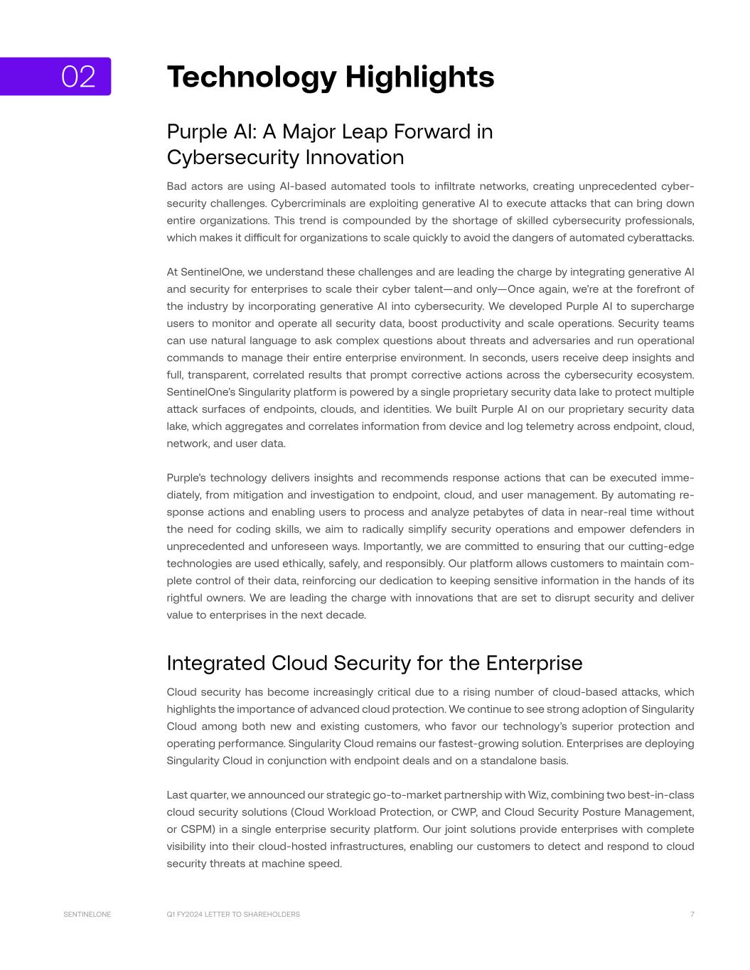 Q1 FY2024 LETTER TO SHAREHOLDERS 7SENTINELONE Technology Highlights Purple AI: A Major Leap Forward in Cybersecurity Innovation Bad actors are using AI-based automated tools to infiltrate networks, creating unprecedented cyber- security challenges. Cybercriminals are exploiting generative AI to execute attacks that can bring down entire organizations. This trend is compounded by the shortage of skilled cybersecurity professionals, which makes it difficult for organizations to scale quickly to avoid the dangers of automated cyberattacks. At SentinelOne, we understand these challenges and are leading the charge by integrating generative AI and security for enterprises to scale their cyber talent—and only—Once again, we’re at the forefront of the industry by incorporating generative AI into cybersecurity. We developed Purple AI to supercharge users to monitor and operate all security data, boost productivity and scale operations. Security teams can use natural language to ask complex questions about threats and adversaries and run operational commands to manage their entire enterprise environment. In seconds, users receive deep insights and full, transparent, correlated results that prompt corrective actions across the cybersecurity ecosystem. SentinelOne’s Singularity platform is powered by a single proprietary security data lake to protect multiple attack surfaces of endpoints, clouds, and identities. We built Purple AI on our proprietary security data lake, which aggregates and correlates information from device and log telemetry across endpoint, cloud, network, and user data. Purple’s technology delivers insights and recommends response actions that can be executed imme- diately, from mitigation and investigation to endpoint, cloud, and user management. By automating re- sponse actions and enabling users to process and analyze petabytes of data in near-real time without the need for coding skills, we aim to radically simplify security operations and empower defenders in unprecedented and unforeseen ways. Importantly, we are committed to ensuring that our cutting-edge technologies are used ethically, safely, and responsibly. Our platform allows customers to maintain com- plete control of their data, reinforcing our dedication to keeping sensitive information in the hands of its rightful owners. We are leading the charge with innovations that are set to disrupt security and deliver value to enterprises in the next decade. Integrated Cloud Security for the Enterprise Cloud security has become increasingly critical due to a rising number of cloud-based attacks, which highlights the importance of advanced cloud protection. We continue to see strong adoption of Singularity Cloud among both new and existing customers, who favor our technology’s superior protection and operating performance. Singularity Cloud remains our fastest-growing solution. Enterprises are deploying Singularity Cloud in conjunction with endpoint deals and on a standalone basis. Last quarter, we announced our strategic go-to-market partnership with Wiz, combining two best-in-class cloud security solutions (Cloud Workload Protection, or CWP, and Cloud Security Posture Management, or CSPM) in a single enterprise security platform. Our joint solutions provide enterprises with complete visibility into their cloud-hosted infrastructures, enabling our customers to detect and respond to cloud security threats at machine speed. 02