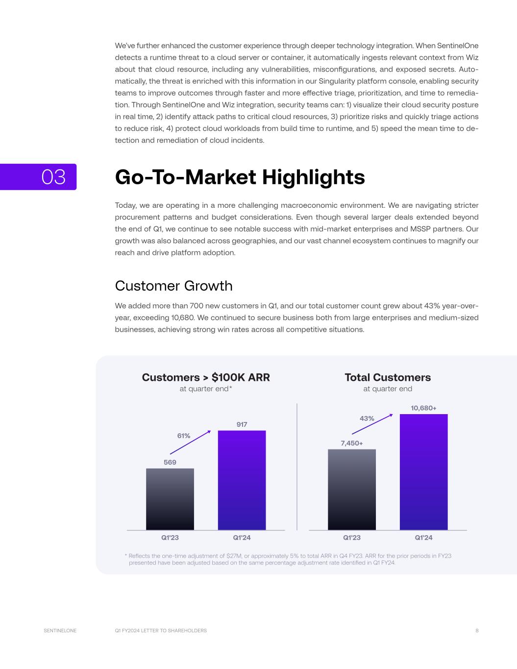 Q1 FY2024 LETTER TO SHAREHOLDERS 8SENTINELONE We’ve further enhanced the customer experience through deeper technology integration. When SentinelOne detects a runtime threat to a cloud server or container, it automatically ingests relevant context from Wiz about that cloud resource, including any vulnerabilities, misconfigurations, and exposed secrets. Auto- matically, the threat is enriched with this information in our Singularity platform console, enabling security teams to improve outcomes through faster and more effective triage, prioritization, and time to remedia- tion. Through SentinelOne and Wiz integration, security teams can: 1) visualize their cloud security posture in real time, 2) identify attack paths to critical cloud resources, 3) prioritize risks and quickly triage actions to reduce risk, 4) protect cloud workloads from build time to runtime, and 5) speed the mean time to de- tection and remediation of cloud incidents. Go-To-Market Highlights Today, we are operating in a more challenging macroeconomic environment. We are navigating stricter procurement patterns and budget considerations. Even though several larger deals extended beyond the end of Q1, we continue to see notable success with mid-market enterprises and MSSP partners. Our growth was also balanced across geographies, and our vast channel ecosystem continues to magnify our reach and drive platform adoption. Customer Growth We added more than 700 new customers in Q1, and our total customer count grew about 43% year-over- year, exceeding 10,680. We continued to secure business both from large enterprises and medium-sized businesses, achieving strong win rates across all competitive situations. 569 Q1'23 Customers > $100K ARR at quarter end* Total Customers at quarter end 61% 7,450+ Q1'23 917 Q1'24 10,680+ Q1'24 43% * Reflects the one-time adjustment of $27M, or approximately 5% to total ARR in Q4 FY23. ARR for the prior periods in FY23 presented have been adjusted based on the same percentage adjustment rate identified in Q1 FY24. 03