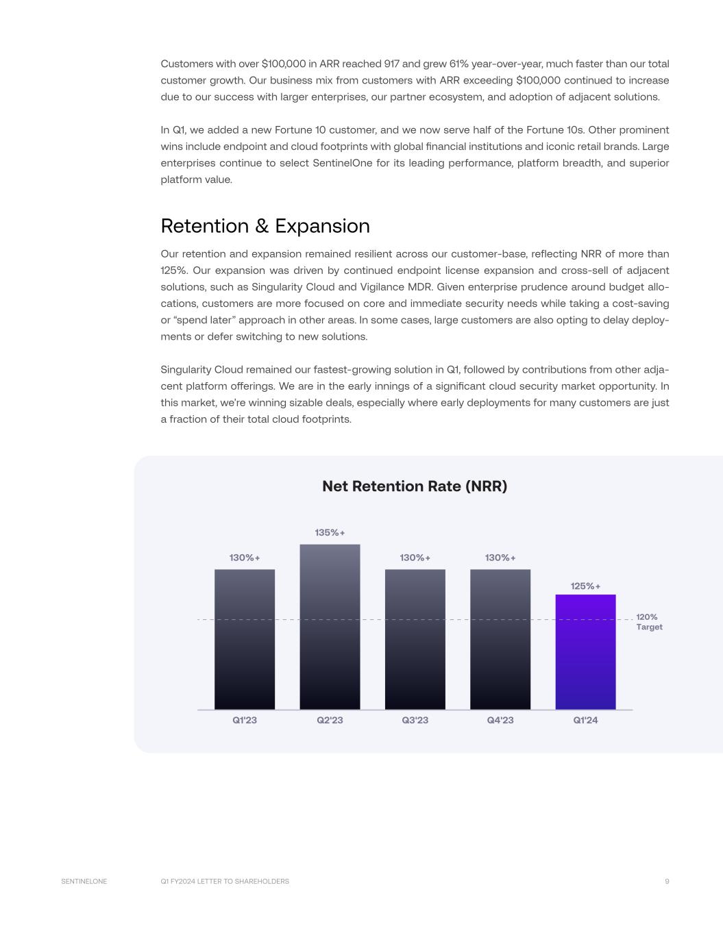 Q1 FY2024 LETTER TO SHAREHOLDERS 9SENTINELONE Customers with over $100,000 in ARR reached 917 and grew 61% year-over-year, much faster than our total customer growth. Our business mix from customers with ARR exceeding $100,000 continued to increase due to our success with larger enterprises, our partner ecosystem, and adoption of adjacent solutions. In Q1, we added a new Fortune 10 customer, and we now serve half of the Fortune 10s. Other prominent wins include endpoint and cloud footprints with global financial institutions and iconic retail brands. Large enterprises continue to select SentinelOne for its leading performance, platform breadth, and superior platform value. Retention & Expansion Our retention and expansion remained resilient across our customer-base, reflecting NRR of more than 125%. Our expansion was driven by continued endpoint license expansion and cross-sell of adjacent solutions, such as Singularity Cloud and Vigilance MDR. Given enterprise prudence around budget allo- cations, customers are more focused on core and immediate security needs while taking a cost-saving or “spend later” approach in other areas. In some cases, large customers are also opting to delay deploy- ments or defer switching to new solutions. Singularity Cloud remained our fastest-growing solution in Q1, followed by contributions from other adja- cent platform offerings. We are in the early innings of a significant cloud security market opportunity. In this market, we’re winning sizable deals, especially where early deployments for many customers are just a fraction of their total cloud footprints. 130%+ 130%+ 120% Target 130%+ 135%+ Q1'23 Q2'23 Q3'23 Q4'23 Q1'24 Net Retention Rate (NRR) 125%+