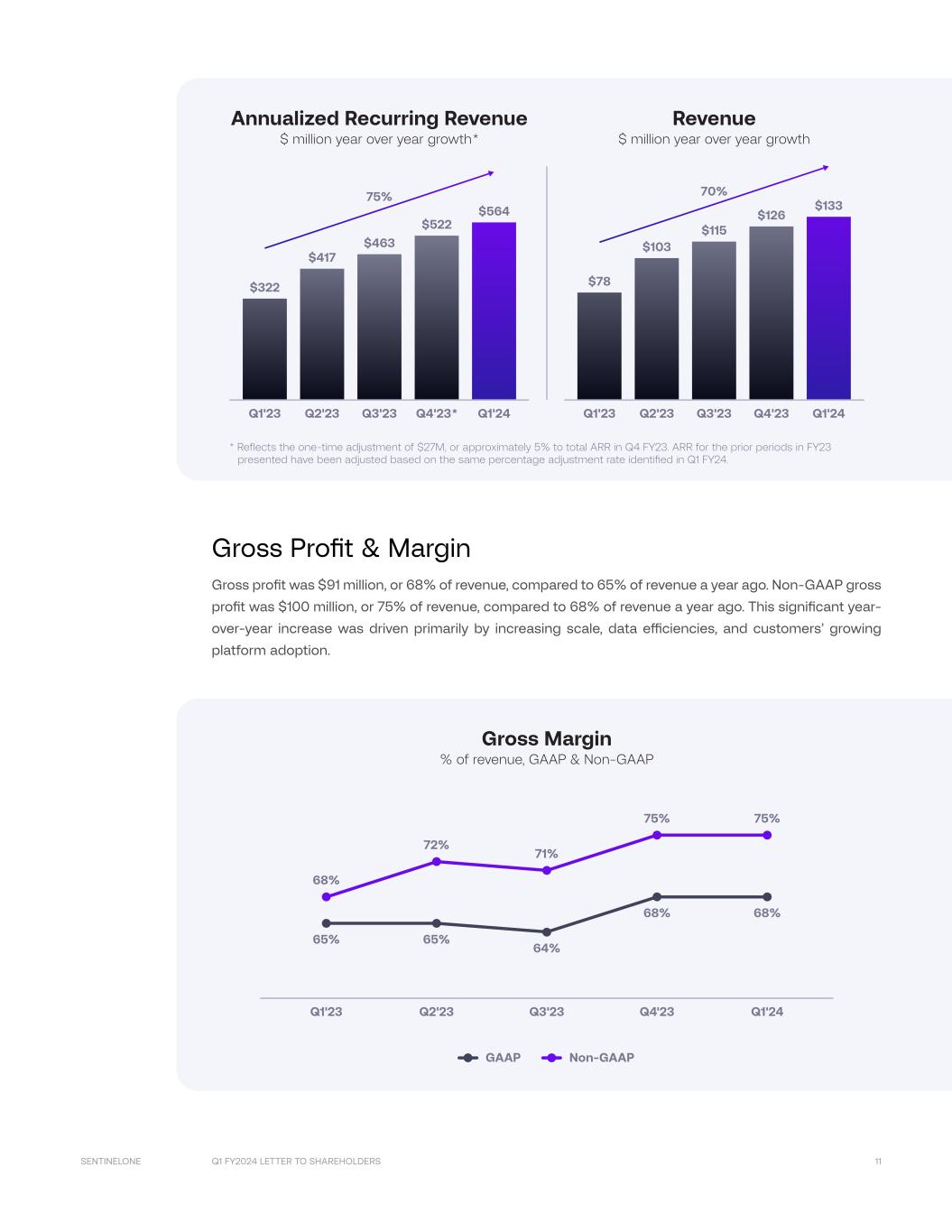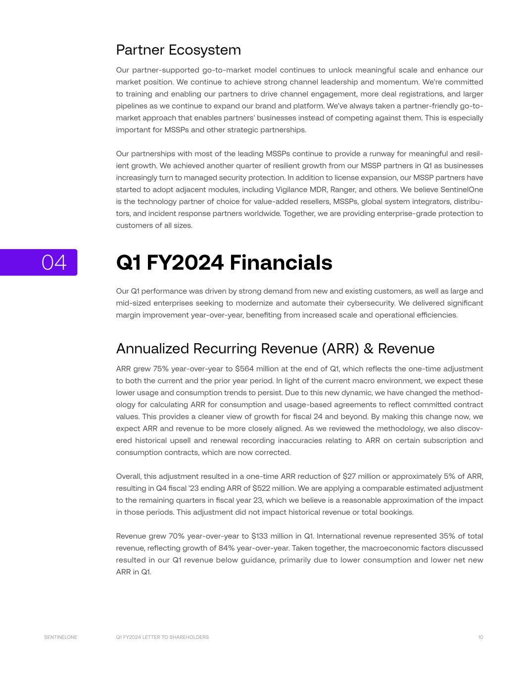Q1 FY2024 LETTER TO SHAREHOLDERS 10SENTINELONE Partner Ecosystem Our partner-supported go-to-market model continues to unlock meaningful scale and enhance our market position. We continue to achieve strong channel leadership and momentum. We’re committed to training and enabling our partners to drive channel engagement, more deal registrations, and larger pipelines as we continue to expand our brand and platform. We’ve always taken a partner-friendly go-to- market approach that enables partners’ businesses instead of competing against them. This is especially important for MSSPs and other strategic partnerships. Our partnerships with most of the leading MSSPs continue to provide a runway for meaningful and resil- ient growth. We achieved another quarter of resilient growth from our MSSP partners in Q1 as businesses increasingly turn to managed security protection. In addition to license expansion, our MSSP partners have started to adopt adjacent modules, including Vigilance MDR, Ranger, and others. We believe SentinelOne is the technology partner of choice for value-added resellers, MSSPs, global system integrators, distribu- tors, and incident response partners worldwide. Together, we are providing enterprise-grade protection to customers of all sizes. Q1 FY2024 Financials Our Q1 performance was driven by strong demand from new and existing customers, as well as large and mid-sized enterprises seeking to modernize and automate their cybersecurity. We delivered significant margin improvement year-over-year, benefiting from increased scale and operational efficiencies. Annualized Recurring Revenue (ARR) & Revenue ARR grew 75% year-over-year to $564 million at the end of Q1, which reflects the one-time adjustment to both the current and the prior year period. In light of the current macro environment, we expect these lower usage and consumption trends to persist. Due to this new dynamic, we have changed the method- ology for calculating ARR for consumption and usage-based agreements to reflect committed contract values. This provides a cleaner view of growth for fiscal 24 and beyond. By making this change now, we expect ARR and revenue to be more closely aligned. As we reviewed the methodology, we also discov- ered historical upsell and renewal recording inaccuracies relating to ARR on certain subscription and consumption contracts, which are now corrected. Overall, this adjustment resulted in a one-time ARR reduction of $27 million or approximately 5% of ARR, resulting in Q4 fiscal ‘23 ending ARR of $522 million. We are applying a comparable estimated adjustment to the remaining quarters in fiscal year 23, which we believe is a reasonable approximation of the impact in those periods. This adjustment did not impact historical revenue or total bookings. Revenue grew 70% year-over-year to $133 million in Q1. International revenue represented 35% of total revenue, reflecting growth of 84% year-over-year. Taken together, the macroeconomic factors discussed resulted in our Q1 revenue below guidance, primarily due to lower consumption and lower net new ARR in Q1. 04