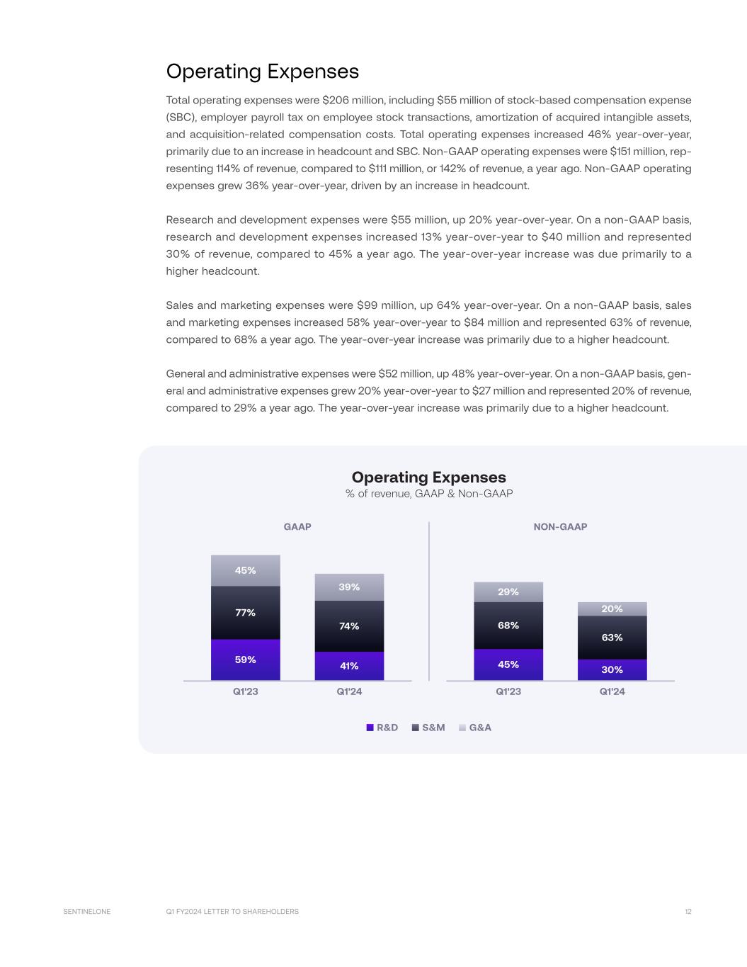 Q1 FY2024 LETTER TO SHAREHOLDERS 12SENTINELONE Operating Expenses Total operating expenses were $206 million, including $55 million of stock-based compensation expense (SBC), employer payroll tax on employee stock transactions, amortization of acquired intangible assets, and acquisition-related compensation costs. Total operating expenses increased 46% year-over-year, primarily due to an increase in headcount and SBC. Non-GAAP operating expenses were $151 million, rep- resenting 114% of revenue, compared to $111 million, or 142% of revenue, a year ago. Non-GAAP operating expenses grew 36% year-over-year, driven by an increase in headcount. Research and development expenses were $55 million, up 20% year-over-year. On a non-GAAP basis, research and development expenses increased 13% year-over-year to $40 million and represented 30% of revenue, compared to 45% a year ago. The year-over-year increase was due primarily to a higher headcount. Sales and marketing expenses were $99 million, up 64% year-over-year. On a non-GAAP basis, sales and marketing expenses increased 58% year-over-year to $84 million and represented 63% of revenue, compared to 68% a year ago. The year-over-year increase was primarily due to a higher headcount. General and administrative expenses were $52 million, up 48% year-over-year. On a non-GAAP basis, gen- eral and administrative expenses grew 20% year-over-year to $27 million and represented 20% of revenue, compared to 29% a year ago. The year-over-year increase was primarily due to a higher headcount. GAAP NON-GAAP Q1'23 Q1'24 45% 30% 68% 63% 29% 20% Q1'23 Q1'24 59% 41% 77% 74% 45% 39% R&D S&M G&A Operating Expenses % of revenue, GAAP & Non-GAAP