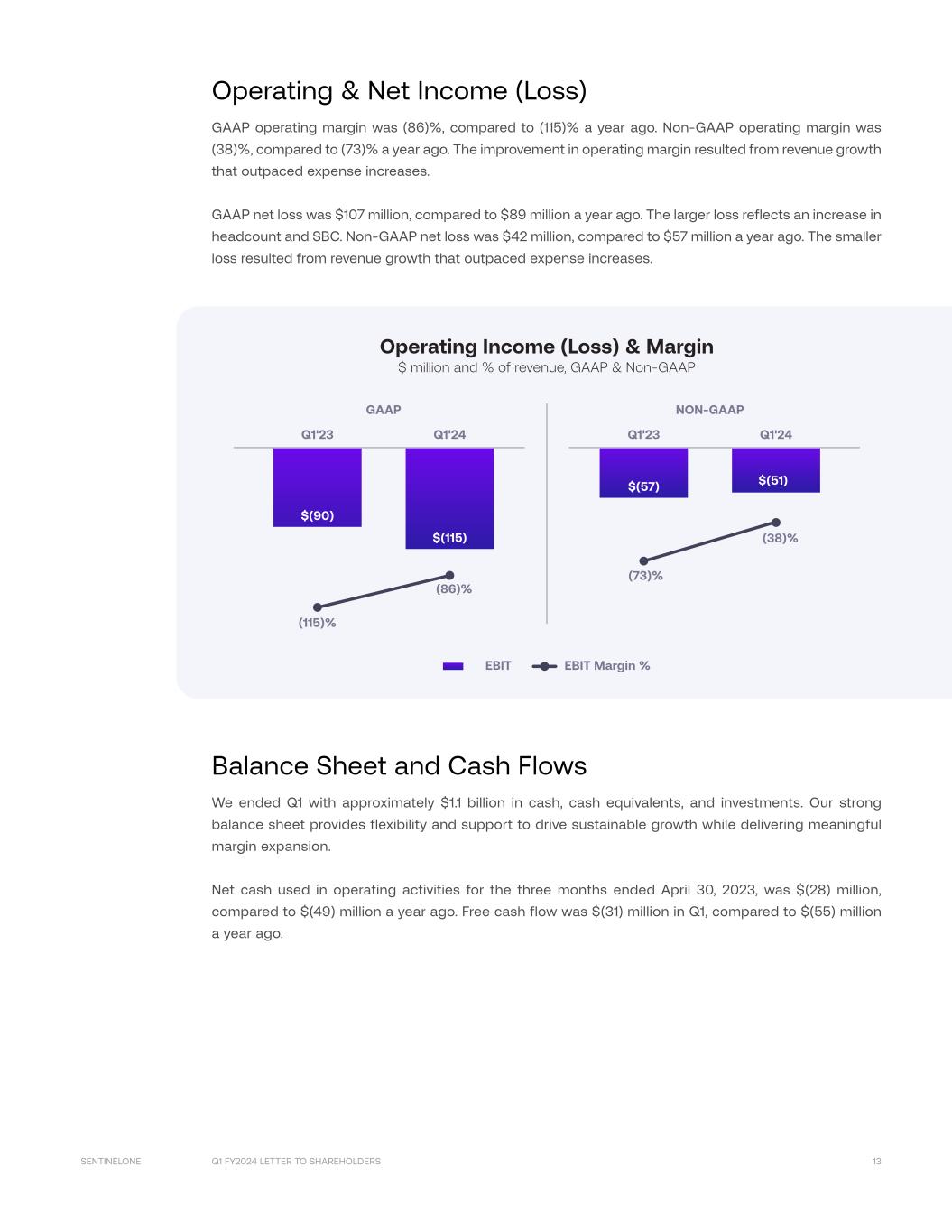 Q1 FY2024 LETTER TO SHAREHOLDERS 13SENTINELONE Operating & Net Income (Loss) GAAP operating margin was (86)%, compared to (115)% a year ago. Non-GAAP operating margin was (38)%, compared to (73)% a year ago. The improvement in operating margin resulted from revenue growth that outpaced expense increases. GAAP net loss was $107 million, compared to $89 million a year ago. The larger loss reflects an increase in headcount and SBC. Non-GAAP net loss was $42 million, compared to $57 million a year ago. The smaller loss resulted from revenue growth that outpaced expense increases. $(90) $(115) Q1'23 Q1'24 EBIT EBIT Margin % $(57) $(51) Q1'23 Q1'24 GAAP NON-GAAP (73)% (38)% (86)% (115)% Operating Income (Loss) & Margin $ million and % of revenue, GAAP & Non-GAAP Balance Sheet and Cash Flows We ended Q1 with approximately $1.1 billion in cash, cash equivalents, and investments. Our strong balance sheet provides flexibility and support to drive sustainable growth while delivering meaningful margin expansion. Net cash used in operating activities for the three months ended April 30, 2023, was $(28) million, compared to $(49) million a year ago. Free cash flow was $(31) million in Q1, compared to $(55) million a year ago.