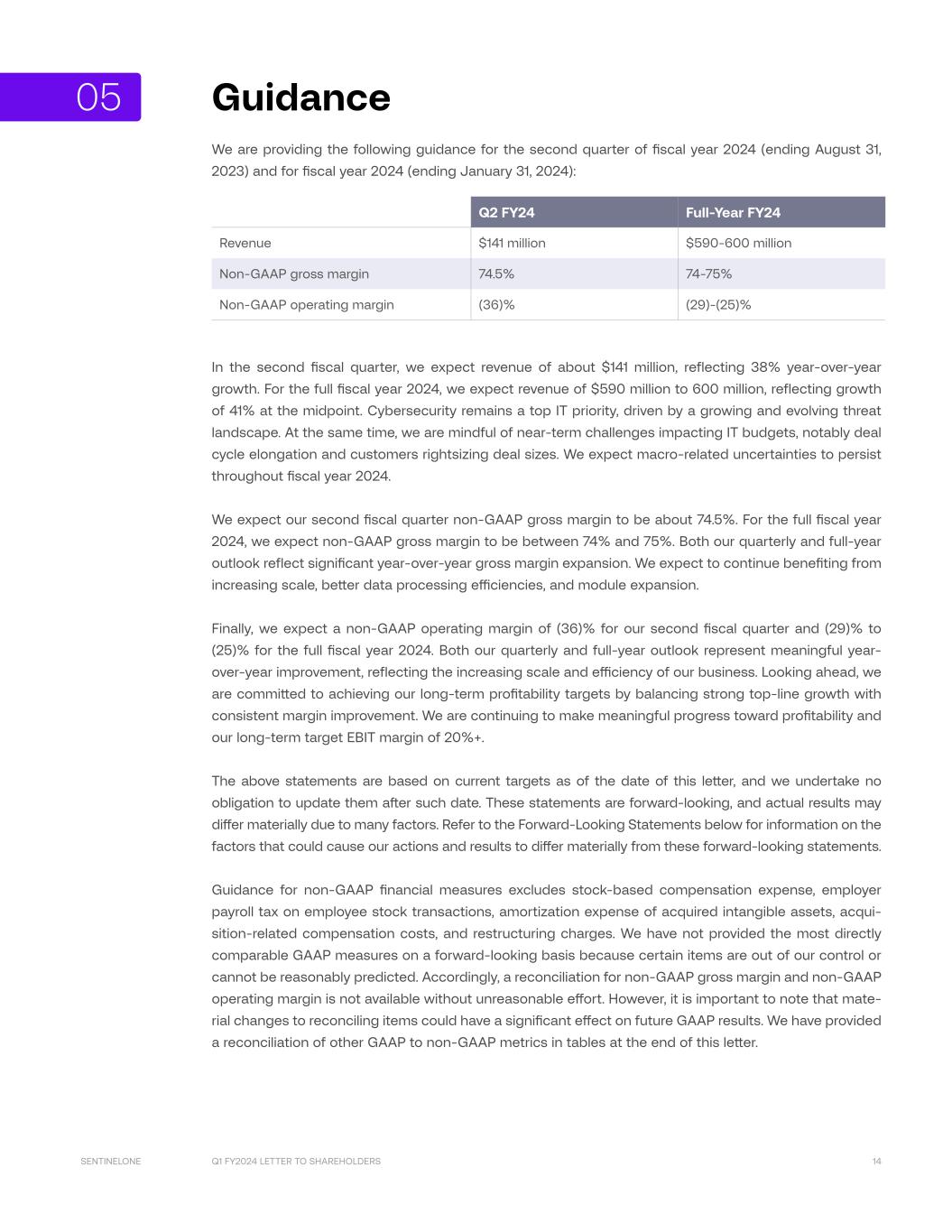 Q1 FY2024 LETTER TO SHAREHOLDERS 14SENTINELONE Guidance We are providing the following guidance for the second quarter of fiscal year 2024 (ending August 31, 2023) and for fiscal year 2024 (ending January 31, 2024): Q2 FY24 Full-Year FY24 Revenue $141 million $590-600 million Non-GAAP gross margin 74.5% 74-75% Non-GAAP operating margin (36)% (29)-(25)% In the second fiscal quarter, we expect revenue of about $141 million, reflecting 38% year-over-year growth. For the full fiscal year 2024, we expect revenue of $590 million to 600 million, reflecting growth of 41% at the midpoint. Cybersecurity remains a top IT priority, driven by a growing and evolving threat landscape. At the same time, we are mindful of near-term challenges impacting IT budgets, notably deal cycle elongation and customers rightsizing deal sizes. We expect macro-related uncertainties to persist throughout fiscal year 2024. We expect our second fiscal quarter non-GAAP gross margin to be about 74.5%. For the full fiscal year 2024, we expect non-GAAP gross margin to be between 74% and 75%. Both our quarterly and full-year outlook reflect significant year-over-year gross margin expansion. We expect to continue benefiting from increasing scale, better data processing efficiencies, and module expansion. Finally, we expect a non-GAAP operating margin of (36)% for our second fiscal quarter and (29)% to (25)% for the full fiscal year 2024. Both our quarterly and full-year outlook represent meaningful year- over-year improvement, reflecting the increasing scale and efficiency of our business. Looking ahead, we are committed to achieving our long-term profitability targets by balancing strong top-line growth with consistent margin improvement. We are continuing to make meaningful progress toward profitability and our long-term target EBIT margin of 20%+. The above statements are based on current targets as of the date of this letter, and we undertake no obligation to update them after such date. These statements are forward-looking, and actual results may differ materially due to many factors. Refer to the Forward-Looking Statements below for information on the factors that could cause our actions and results to differ materially from these forward-looking statements. Guidance for non-GAAP financial measures excludes stock-based compensation expense, employer payroll tax on employee stock transactions, amortization expense of acquired intangible assets, acqui- sition-related compensation costs, and restructuring charges. We have not provided the most directly comparable GAAP measures on a forward-looking basis because certain items are out of our control or cannot be reasonably predicted. Accordingly, a reconciliation for non-GAAP gross margin and non-GAAP operating margin is not available without unreasonable effort. However, it is important to note that mate- rial changes to reconciling items could have a significant effect on future GAAP results. We have provided a reconciliation of other GAAP to non-GAAP metrics in tables at the end of this letter. 05