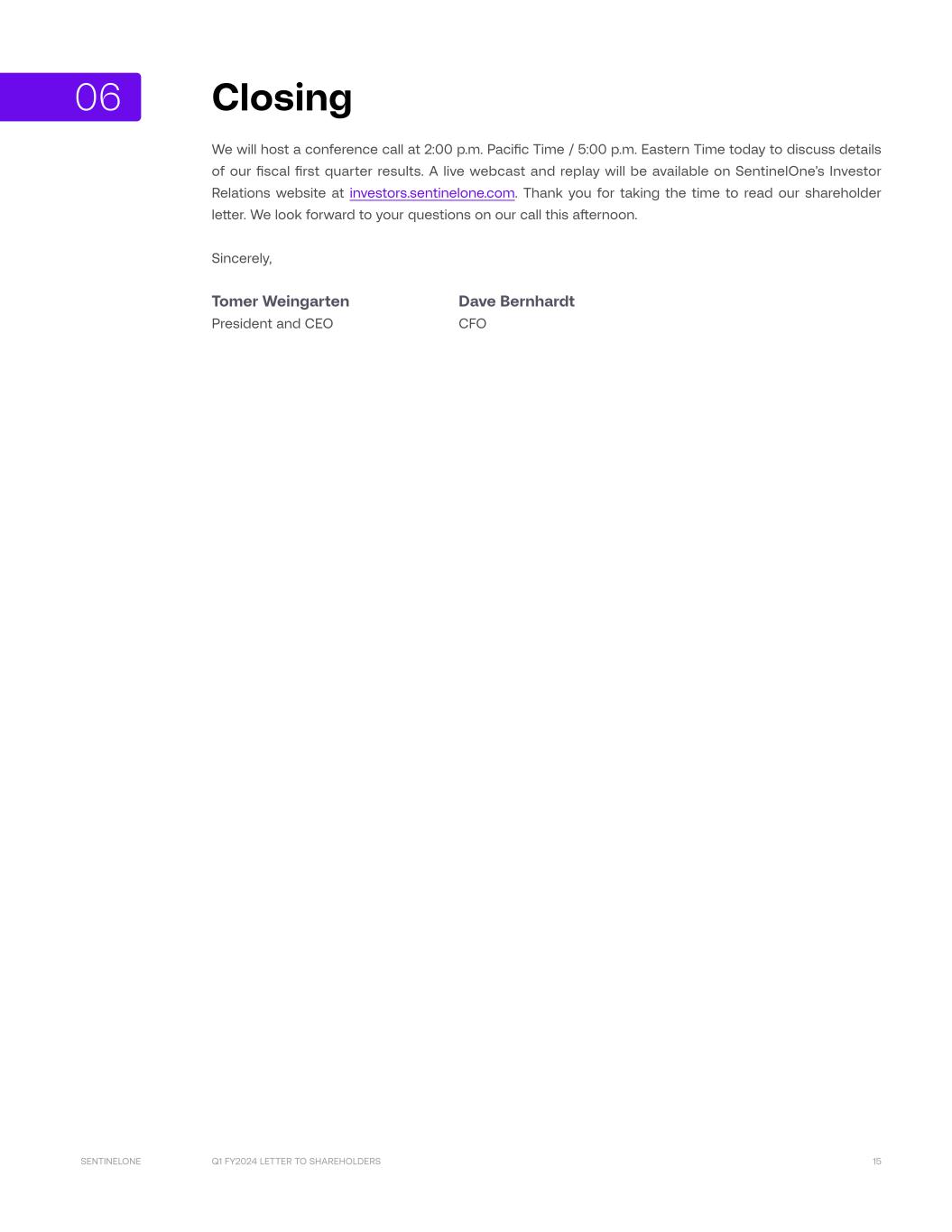 Q1 FY2024 LETTER TO SHAREHOLDERS 15SENTINELONE Closing We will host a conference call at 2:00 p.m. Pacific Time / 5:00 p.m. Eastern Time today to discuss details of our fiscal first quarter results. A live webcast and replay will be available on SentinelOne’s Investor Relations website at investors.sentinelone.com. Thank you for taking the time to read our shareholder letter. We look forward to your questions on our call this afternoon. Sincerely, Tomer Weingarten Dave Bernhardt President and CEO CFO 06