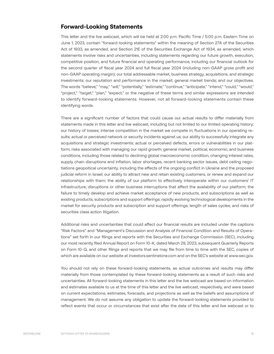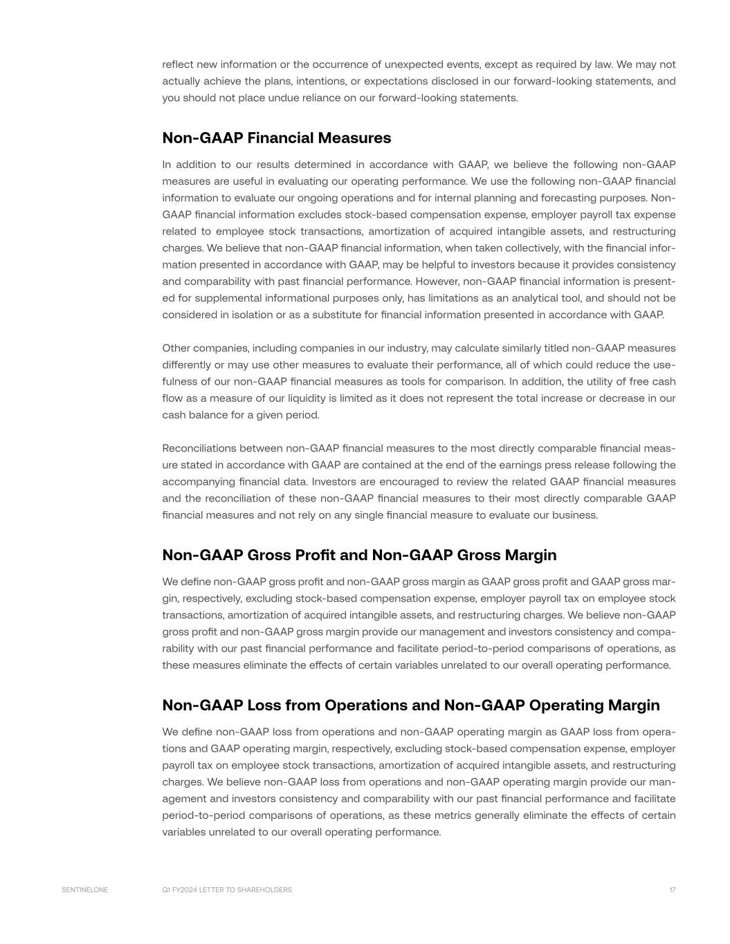 Q1 FY2024 LETTER TO SHAREHOLDERS 17SENTINELONE reflect new information or the occurrence of unexpected events, except as required by law. We may not actually achieve the plans, intentions, or expectations disclosed in our forward-looking statements, and you should not place undue reliance on our forward-looking statements. Non-GAAP Financial Measures In addition to our results determined in accordance with GAAP, we believe the following non-GAAP measures are useful in evaluating our operating performance. We use the following non-GAAP financial information to evaluate our ongoing operations and for internal planning and forecasting purposes. Non- GAAP financial information excludes stock-based compensation expense, employer payroll tax expense related to employee stock transactions, amortization of acquired intangible assets, and restructuring charges. We believe that non-GAAP financial information, when taken collectively, with the financial infor- mation presented in accordance with GAAP, may be helpful to investors because it provides consistency and comparability with past financial performance. However, non-GAAP financial information is present- ed for supplemental informational purposes only, has limitations as an analytical tool, and should not be considered in isolation or as a substitute for financial information presented in accordance with GAAP. Other companies, including companies in our industry, may calculate similarly titled non-GAAP measures differently or may use other measures to evaluate their performance, all of which could reduce the use- fulness of our non-GAAP financial measures as tools for comparison. In addition, the utility of free cash flow as a measure of our liquidity is limited as it does not represent the total increase or decrease in our cash balance for a given period. Reconciliations between non-GAAP financial measures to the most directly comparable financial meas- ure stated in accordance with GAAP are contained at the end of the earnings press release following the accompanying financial data. Investors are encouraged to review the related GAAP financial measures and the reconciliation of these non-GAAP financial measures to their most directly comparable GAAP financial measures and not rely on any single financial measure to evaluate our business. Non-GAAP Gross Profit and Non-GAAP Gross Margin We define non-GAAP gross profit and non-GAAP gross margin as GAAP gross profit and GAAP gross mar- gin, respectively, excluding stock-based compensation expense, employer payroll tax on employee stock transactions, amortization of acquired intangible assets, and restructuring charges. We believe non-GAAP gross profit and non-GAAP gross margin provide our management and investors consistency and compa- rability with our past financial performance and facilitate period-to-period comparisons of operations, as these measures eliminate the effects of certain variables unrelated to our overall operating performance. Non-GAAP Loss from Operations and Non-GAAP Operating Margin We define non-GAAP loss from operations and non-GAAP operating margin as GAAP loss from opera- tions and GAAP operating margin, respectively, excluding stock-based compensation expense, employer payroll tax on employee stock transactions, amortization of acquired intangible assets, and restructuring charges. We believe non-GAAP loss from operations and non-GAAP operating margin provide our man- agement and investors consistency and comparability with our past financial performance and facilitate period-to-period comparisons of operations, as these metrics generally eliminate the effects of certain variables unrelated to our overall operating performance.