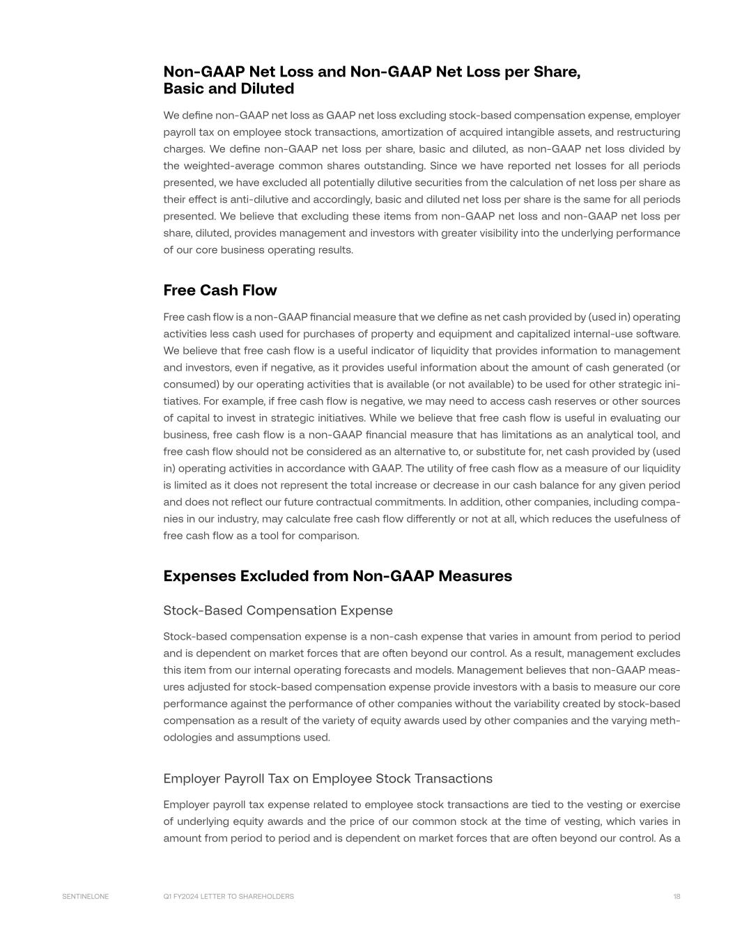 Q1 FY2024 LETTER TO SHAREHOLDERS 18SENTINELONE Non-GAAP Net Loss and Non-GAAP Net Loss per Share, Basic and Diluted We define non-GAAP net loss as GAAP net loss excluding stock-based compensation expense, employer payroll tax on employee stock transactions, amortization of acquired intangible assets, and restructuring charges. We define non-GAAP net loss per share, basic and diluted, as non-GAAP net loss divided by the weighted-average common shares outstanding. Since we have reported net losses for all periods presented, we have excluded all potentially dilutive securities from the calculation of net loss per share as their effect is anti-dilutive and accordingly, basic and diluted net loss per share is the same for all periods presented. We believe that excluding these items from non-GAAP net loss and non-GAAP net loss per share, diluted, provides management and investors with greater visibility into the underlying performance of our core business operating results. Free Cash Flow Free cash flow is a non-GAAP financial measure that we define as net cash provided by (used in) operating activities less cash used for purchases of property and equipment and capitalized internal-use software. We believe that free cash flow is a useful indicator of liquidity that provides information to management and investors, even if negative, as it provides useful information about the amount of cash generated (or consumed) by our operating activities that is available (or not available) to be used for other strategic ini- tiatives. For example, if free cash flow is negative, we may need to access cash reserves or other sources of capital to invest in strategic initiatives. While we believe that free cash flow is useful in evaluating our business, free cash flow is a non-GAAP financial measure that has limitations as an analytical tool, and free cash flow should not be considered as an alternative to, or substitute for, net cash provided by (used in) operating activities in accordance with GAAP. The utility of free cash flow as a measure of our liquidity is limited as it does not represent the total increase or decrease in our cash balance for any given period and does not reflect our future contractual commitments. In addition, other companies, including compa- nies in our industry, may calculate free cash flow differently or not at all, which reduces the usefulness of free cash flow as a tool for comparison. Expenses Excluded from Non-GAAP Measures Stock-Based Compensation Expense Stock-based compensation expense is a non-cash expense that varies in amount from period to period and is dependent on market forces that are often beyond our control. As a result, management excludes this item from our internal operating forecasts and models. Management believes that non-GAAP meas- ures adjusted for stock-based compensation expense provide investors with a basis to measure our core performance against the performance of other companies without the variability created by stock-based compensation as a result of the variety of equity awards used by other companies and the varying meth- odologies and assumptions used. Employer Payroll Tax on Employee Stock Transactions Employer payroll tax expense related to employee stock transactions are tied to the vesting or exercise of underlying equity awards and the price of our common stock at the time of vesting, which varies in amount from period to period and is dependent on market forces that are often beyond our control. As a