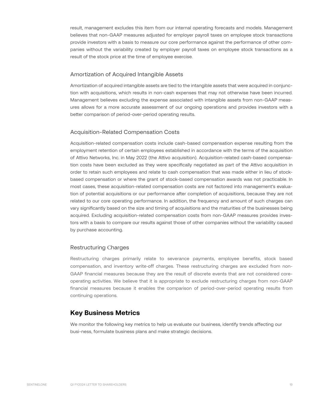 Q1 FY2024 LETTER TO SHAREHOLDERS 19SENTINELONE result, management excludes this item from our internal operating forecasts and models. Management believes that non-GAAP measures adjusted for employer payroll taxes on employee stock transactions provide investors with a basis to measure our core performance against the performance of other com- panies without the variability created by employer payroll taxes on employee stock transactions as a result of the stock price at the time of employee exercise. Amortization of Acquired Intangible Assets Amortization of acquired intangible assets are tied to the intangible assets that were acquired in conjunc- tion with acquisitions, which results in non-cash expenses that may not otherwise have been incurred. Management believes excluding the expense associated with intangible assets from non-GAAP meas- ures allows for a more accurate assessment of our ongoing operations and provides investors with a better comparison of period-over-period operating results. Acquisition-Related Compensation Costs Acquisition-related compensation costs include cash-based compensation expense resulting from the employment retention of certain employees established in accordance with the terms of the acquisition of Attivo Networks, Inc. in May 2022 (the Attivo acquisition). Acquisition-related cash-based compensa- tion costs have been excluded as they were specifically negotiated as part of the Attivo acquisition in order to retain such employees and relate to cash compensation that was made either in lieu of stock- based compensation or where the grant of stock-based compensation awards was not practicable. In most cases, these acquisition-related compensation costs are not factored into management's evalua- tion of potential acquisitions or our performance after completion of acquisitions, because they are not related to our core operating performance. In addition, the frequency and amount of such charges can vary significantly based on the size and timing of acquisitions and the maturities of the businesses being acquired. Excluding acquisition-related compensation costs from non-GAAP measures provides inves- tors with a basis to compare our results against those of other companies without the variability caused by purchase accounting. Restructuring Charges Restructuring charges primarily relate to severance payments, employee benefits, stock based compensation, and inventory write-off charges. These restructuring charges are excluded from non- GAAP financial measures because they are the result of discrete events that are not considered core- operating activities. We believe that it is appropriate to exclude restructuring charges from non-GAAP financial measures because it enables the comparison of period-over-period operating results from continuing operations. Key Business Metrics We monitor the following key metrics to help us evaluate our business, identify trends affecting our busi-ness, formulate business plans and make strategic decisions.