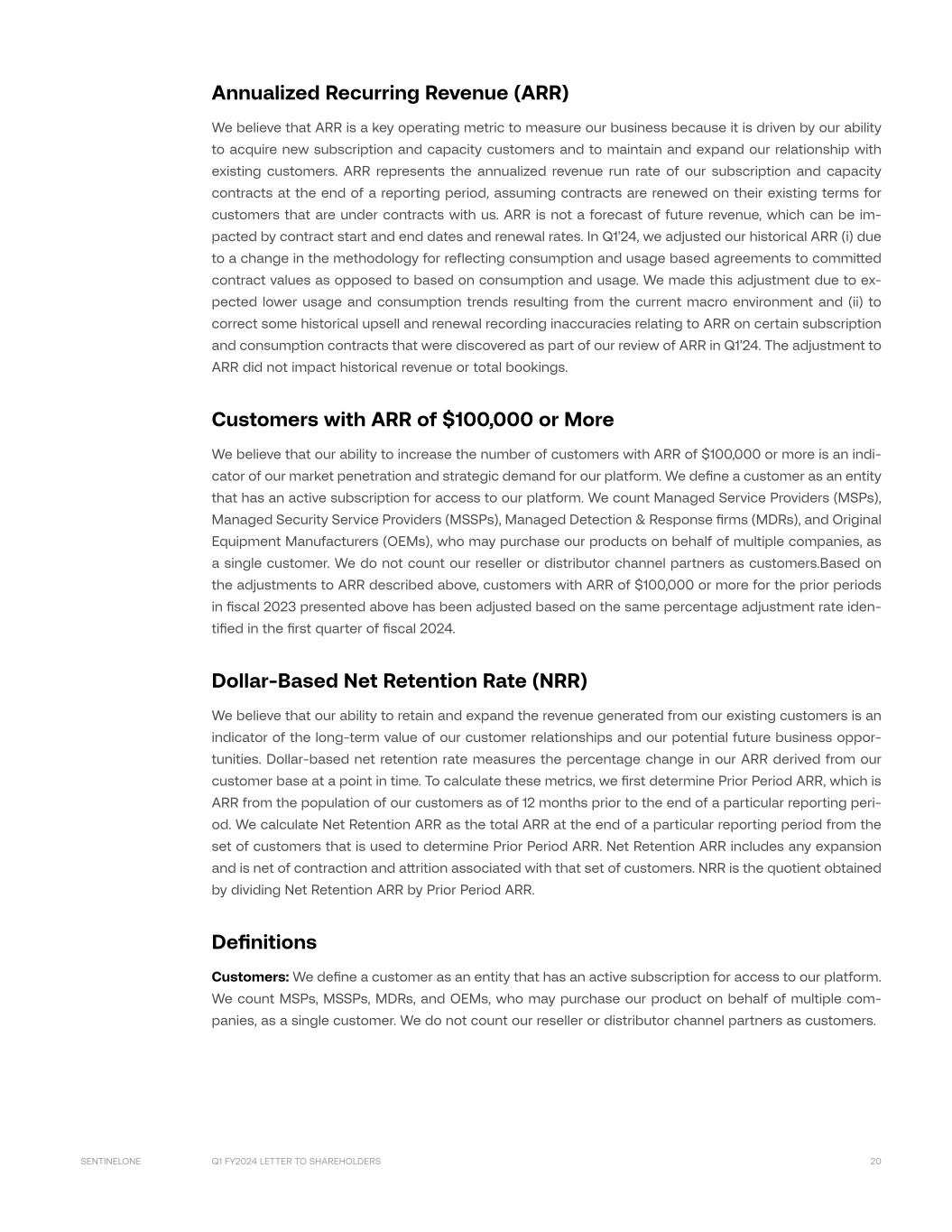 Q1 FY2024 LETTER TO SHAREHOLDERS 20SENTINELONE Annualized Recurring Revenue (ARR) We believe that ARR is a key operating metric to measure our business because it is driven by our ability to acquire new subscription and capacity customers and to maintain and expand our relationship with existing customers. ARR represents the annualized revenue run rate of our subscription and capacity contracts at the end of a reporting period, assuming contracts are renewed on their existing terms for customers that are under contracts with us. ARR is not a forecast of future revenue, which can be im- pacted by contract start and end dates and renewal rates. In Q1’24, we adjusted our historical ARR (i) due to a change in the methodology for reflecting consumption and usage based agreements to committed contract values as opposed to based on consumption and usage. We made this adjustment due to ex- pected lower usage and consumption trends resulting from the current macro environment and (ii) to correct some historical upsell and renewal recording inaccuracies relating to ARR on certain subscription and consumption contracts that were discovered as part of our review of ARR in Q1’24. The adjustment to ARR did not impact historical revenue or total bookings. Customers with ARR of $100,000 or More We believe that our ability to increase the number of customers with ARR of $100,000 or more is an indi- cator of our market penetration and strategic demand for our platform. We define a customer as an entity that has an active subscription for access to our platform. We count Managed Service Providers (MSPs), Managed Security Service Providers (MSSPs), Managed Detection & Response firms (MDRs), and Original Equipment Manufacturers (OEMs), who may purchase our products on behalf of multiple companies, as a single customer. We do not count our reseller or distributor channel partners as customers.Based on the adjustments to ARR described above, customers with ARR of $100,000 or more for the prior periods in fiscal 2023 presented above has been adjusted based on the same percentage adjustment rate iden- tified in the first quarter of fiscal 2024. Dollar-Based Net Retention Rate (NRR) We believe that our ability to retain and expand the revenue generated from our existing customers is an indicator of the long-term value of our customer relationships and our potential future business oppor- tunities. Dollar-based net retention rate measures the percentage change in our ARR derived from our customer base at a point in time. To calculate these metrics, we first determine Prior Period ARR, which is ARR from the population of our customers as of 12 months prior to the end of a particular reporting peri- od. We calculate Net Retention ARR as the total ARR at the end of a particular reporting period from the set of customers that is used to determine Prior Period ARR. Net Retention ARR includes any expansion and is net of contraction and attrition associated with that set of customers. NRR is the quotient obtained by dividing Net Retention ARR by Prior Period ARR. Definitions Customers: We define a customer as an entity that has an active subscription for access to our platform. We count MSPs, MSSPs, MDRs, and OEMs, who may purchase our product on behalf of multiple com- panies, as a single customer. We do not count our reseller or distributor channel partners as customers.